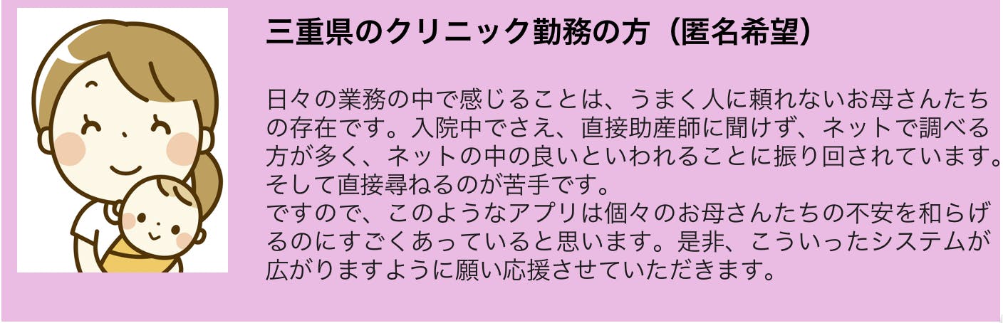 たとえば、ある助産師は、「 日々の業務の中で感じることは、うまく人に頼れないお母さんたちの存在です。入院中でさえ、直接助産師に聞けず、ネットで調べる方が多く、氾濫する情報に振り回されているようです」と言われています。妊産婦さんは、「こんな悩みを聞いて良いのかわからない。自分だけが悩んでいるのかもわからない。」つまり、聞きたくても聞けない、伝えたくても伝えられないという隔たりが助産師と妊産婦さんの間に存在します。
