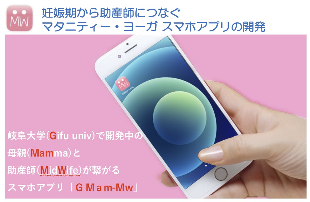 (公財)名古屋産業科学研究所・中部TLOでは、大学などのアカデミアの研究成果が速やかに社会で活用されるよう様々な支援事業を行っています。今回、東海国立大学機構・岐阜大学の研究者らが中心となり実用化を目指している「G Mam-Mw (ジー マム ウイズ): 妊娠期から産後まで、母親と助産師が繋がり続けるスマホアプリ」の研究開発を支援します(図1)。皆さまの応援、よろしくお願いします。