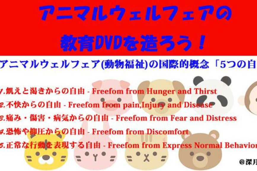 今回のプロジェクトは専門家を招いて、アニマルフェアについて分かりやすく説明するDVDを制作し、勉強会やセミナーを開催していきます。積極的に政治家向けにも啓蒙活動を行っていきます。また、より多くの方にアニマルウエルフェアについて知って頂く為にyoutube映像も作成します。多くの方々にアニマルウェルフェアの問題を知って頂き考えて頂けるきっかけになれば幸いです。
