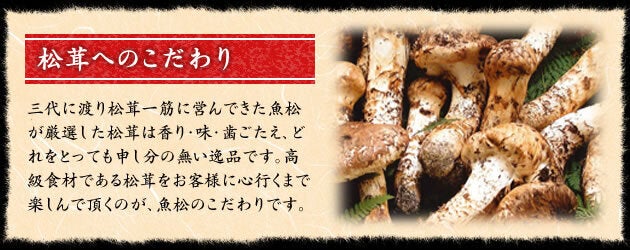 昔から松茸の名産地であった甲賀市に創業した魚松は、シーズンには松茸山を運営し、各地からお見えになるお客さまに、香り・味・歯ごたえのどれをとっても申し分の無い松茸を思う存分に味わっていただいてきました。高級食材である松茸を一年中、いつでも心行くまで楽しんでいただくことが我々魚松のモットーです。