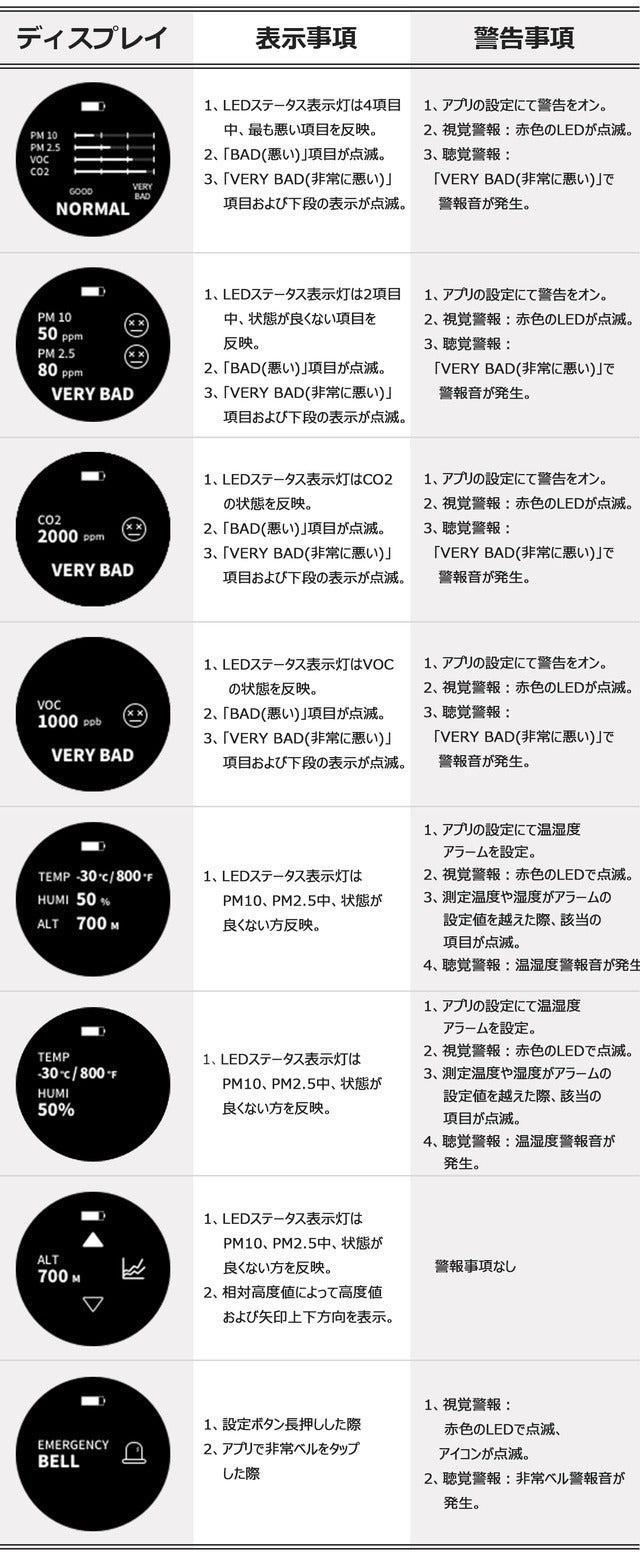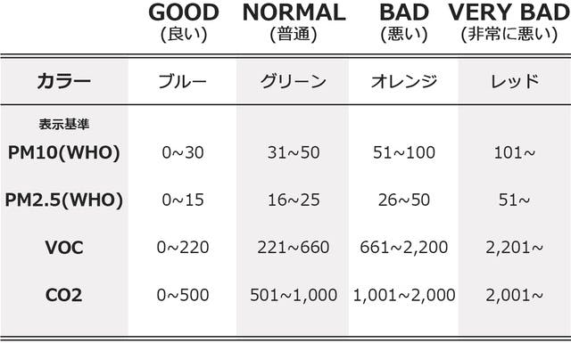 A、PM2.5、PM10、二酸化炭素、温湿度、VOC、相対高度を測定することができます。