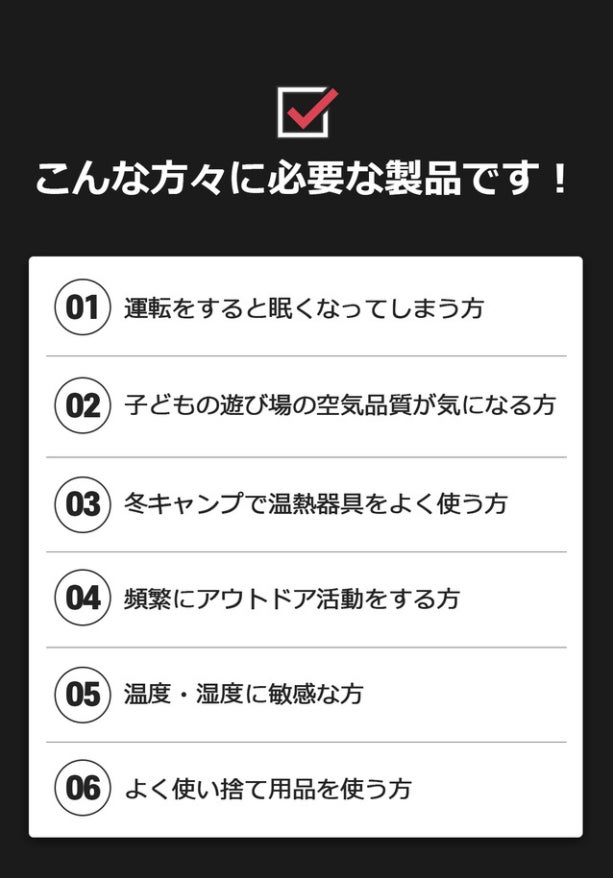 一目で車内や部屋、その空間の二酸化炭素濃度を確認できるので、車や会議室などに1台置いて設定をしておけば換気のタイミングをアラームでお知らせしてくれます!