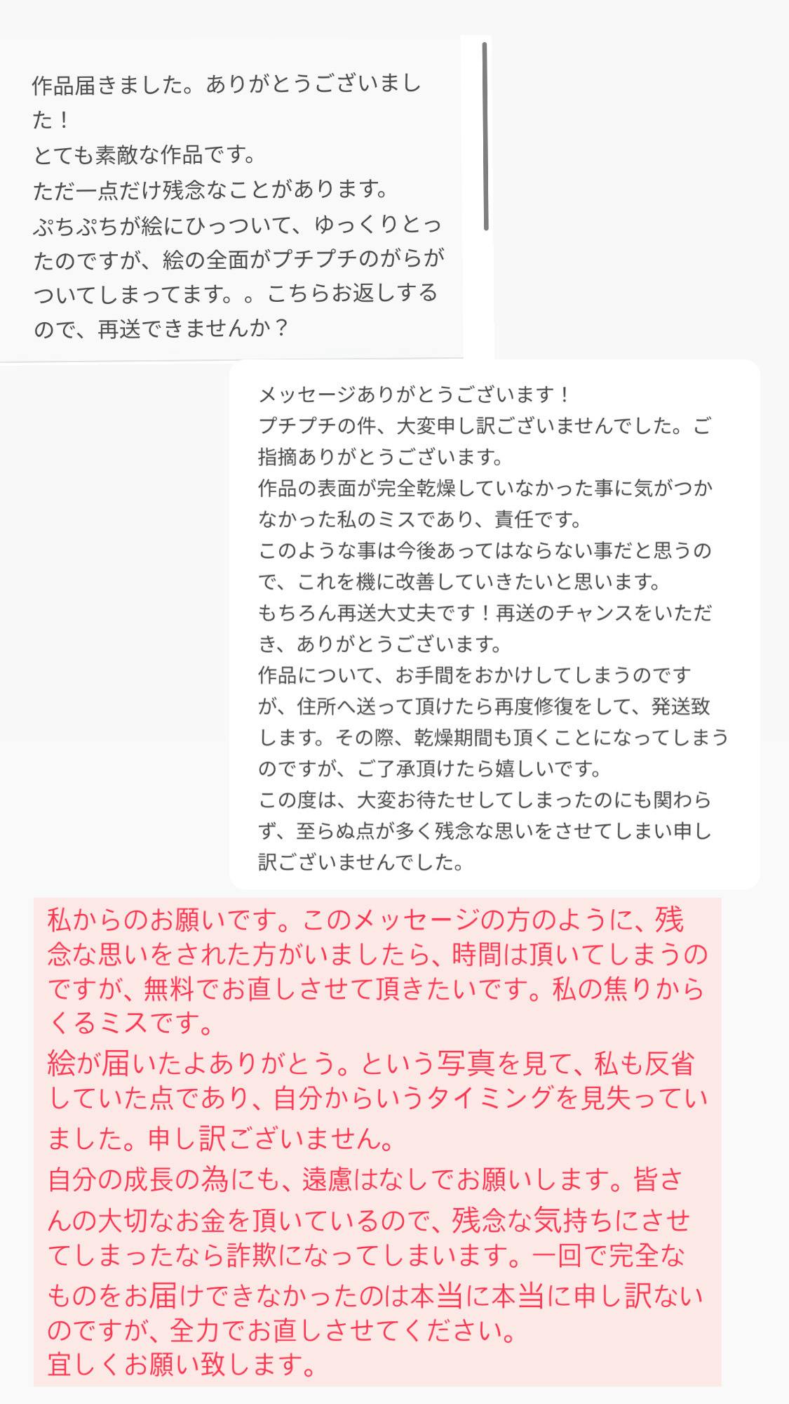 とても貴重なメッセージを頂きました。発送を急いでしまった事による私の至らぬ点です。