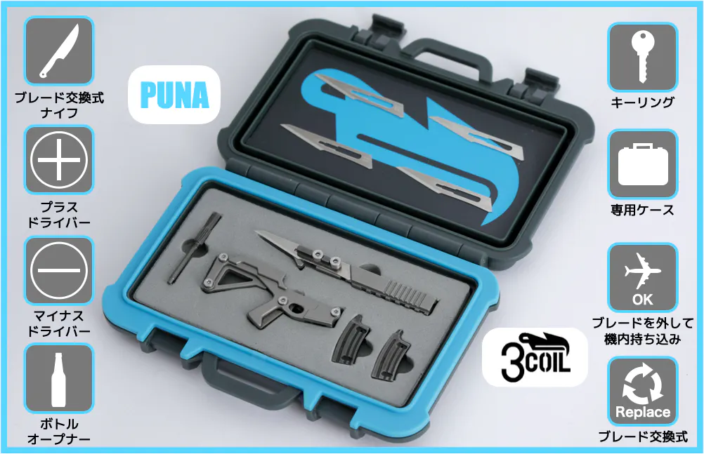 Puna(プナ)は、栓抜きやドライバーに加えて、メイン機能であるナイフは、ブレード交換式のメス刃が装着されています。