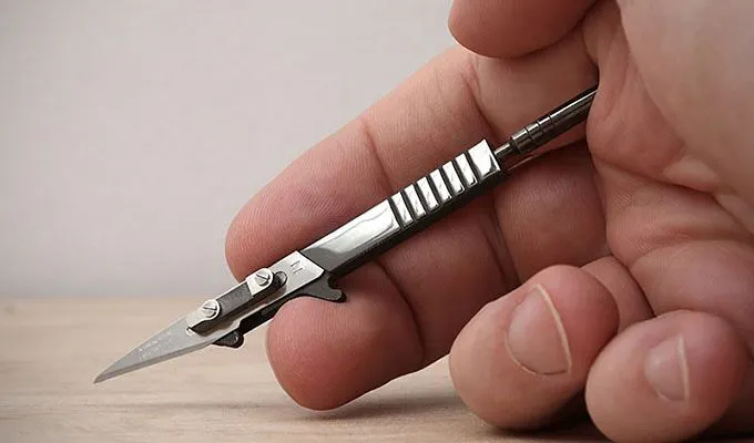 従来のメスの設計はブレードが常に露出しているため危険で、かんたんな持ち運び方法はありませんでした。