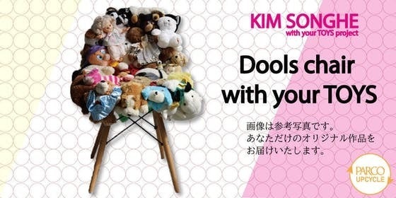 あなたのおもちゃやぬいぐるみを用いたKIM SONGHE(キムソンへ)による世界で唯一のチェア(作品)です。彼女の感性でアソートされたおもちゃやぬいぐるみの数々も楽しみの1つです。存在感がありながらも、かわいく親しみのあるチェアは、みんなが集まる場所で思い出とともに日の目を浴びてほしいという想いが込められています。