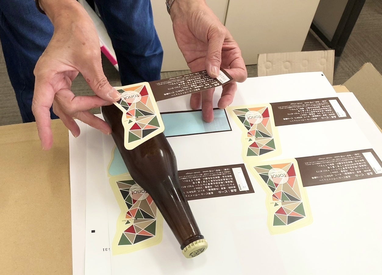 変形もののシールの為、金澤ブルワリーのスタッフの方にもシワが出来ずに貼れるかチェックいただいている様子(添付画像)