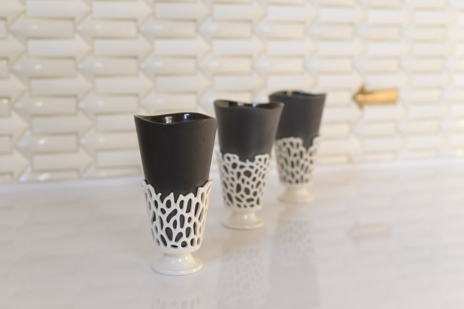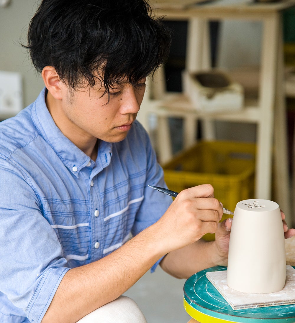 柔らかい液体状の粘土を型に流し込み成形する「鋳込み成形」を利用した量産の技術と、透かし彫りという伝統的な手仕事の技術を取り入れ、色が切り抜いた部分から見える二重構造の、独自の新たな焼き物の表現を完成させました。この技法を活かし、ぐいのみやタンブラーなどの器から照明器具に至るインテリア小物まで幅広く制作しております。