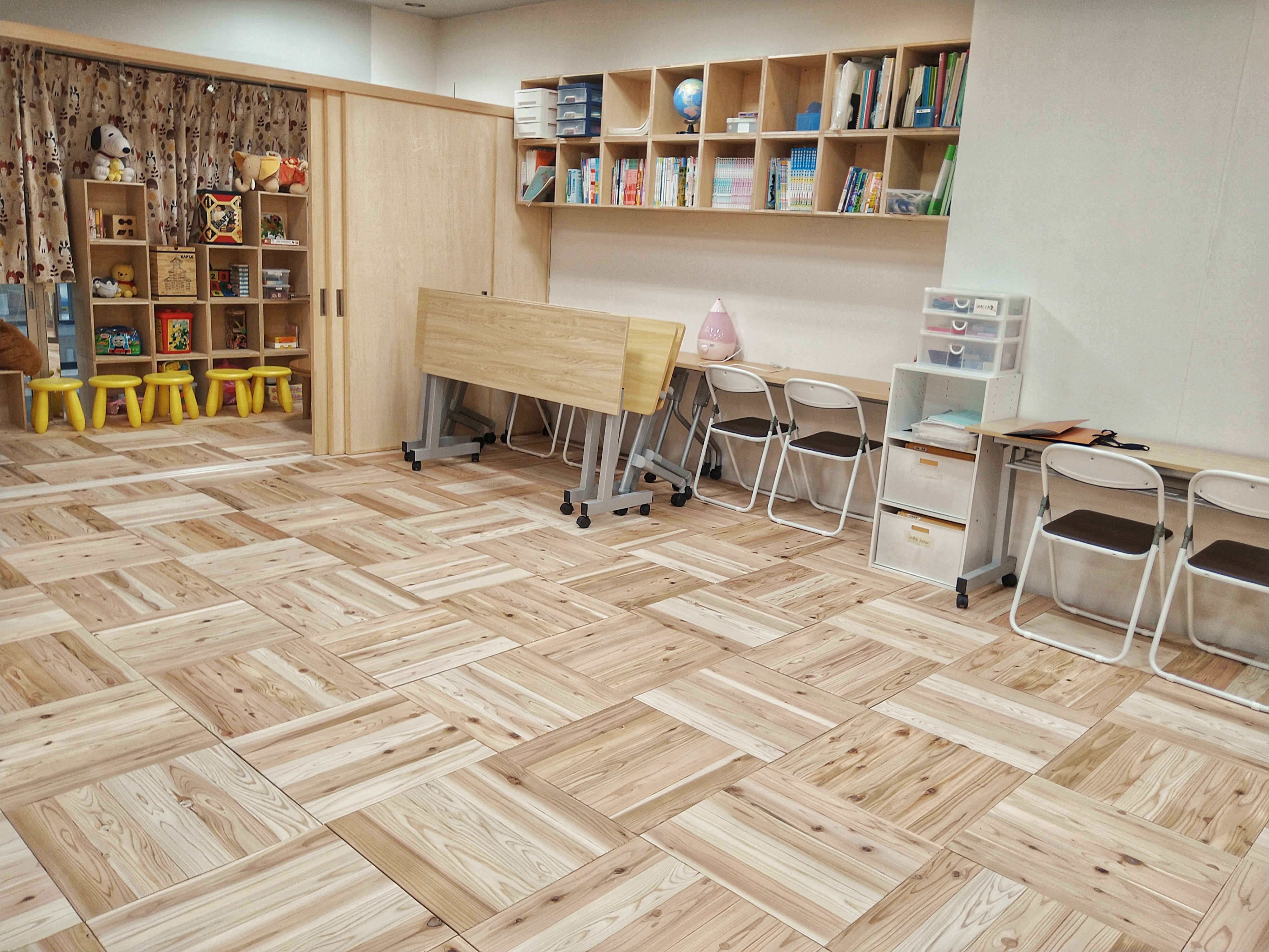WACCA塾スペース、奥のこども部屋はこのようになりました!写真ではなかなか伝わりませんが、以前の場所よりも長机を余裕をもって設置できる広いスペースに!