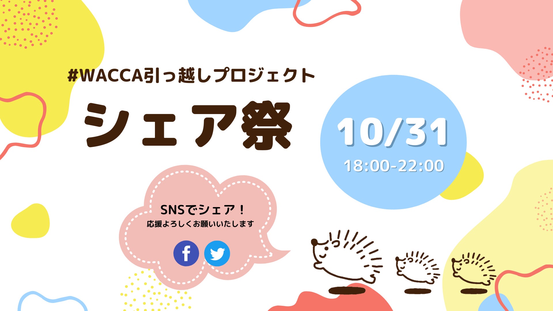 皆様、いつもご支援・応援をいただき、本当にありがとうございます。10月のスタートより一ヶ月が経とうとしていますが、現時点(10/25)で55%の資金を集めることができました!本当にありがとうございます。今回は、残り一ヶ月でもっと多くの方にこのプロジェクトを知っていただくため、折り返し地点の10月31日にシェア祭を開催します!私たちは地域の中で孤立するシングルマザー家庭にたくさん出会ってきました。今回のクラウドファンディングでは、工事資金を集めるだけでなく、一人でも多くの方と繋がり、支え合う人の輪も広げていきたいと願っています。今回の「シェア祭」でも、皆様のお力をいただいて今までWACCAを知らなかった方々と繋がり、困難を抱えるシングルマザー家庭が社会と繋がるきっかりづくりにしていきたいです!同じ時間に皆さんがシェアしてくださることで、大きな輪となりより多くの方に届くきっかけとなります。・日本、世界中どこからでも・SNSでシェアするだけで応援に ぜひ皆さんのお力を借りれたらと思います。~*~*~*~*~*~*~◎開催日2021年10月31日(日)18:00-22:00Facebookでも!Twitterでも!◎参加方法【1】このFacebookイベントの「参加予定」をクリック! 「残り一ヶ月、みんなで盛り上げよう!#WACCA引っ越しプロジェクト シェア祭!」 ぜひお友達の招待もお願いします!【2】2021年10月31日(日)18:00に「ウィメンズネット・こうべ」からポストされる投稿をシェアしてください!※当団体Twitterでも同時間に投稿しますので、シェアをよろしくお願いいたします。#WACCA引っ越しプロジェクト のハッシュタグ付きの応援コメントを添えて盛り上げていただけると嬉しいです!~*~*~*~*~*~*~素敵な居場所づくりのため、もっとプロジェクトを盛り上げたいので、どうかお力を貸してください!たくさんの皆様のご参加をお待ちしております