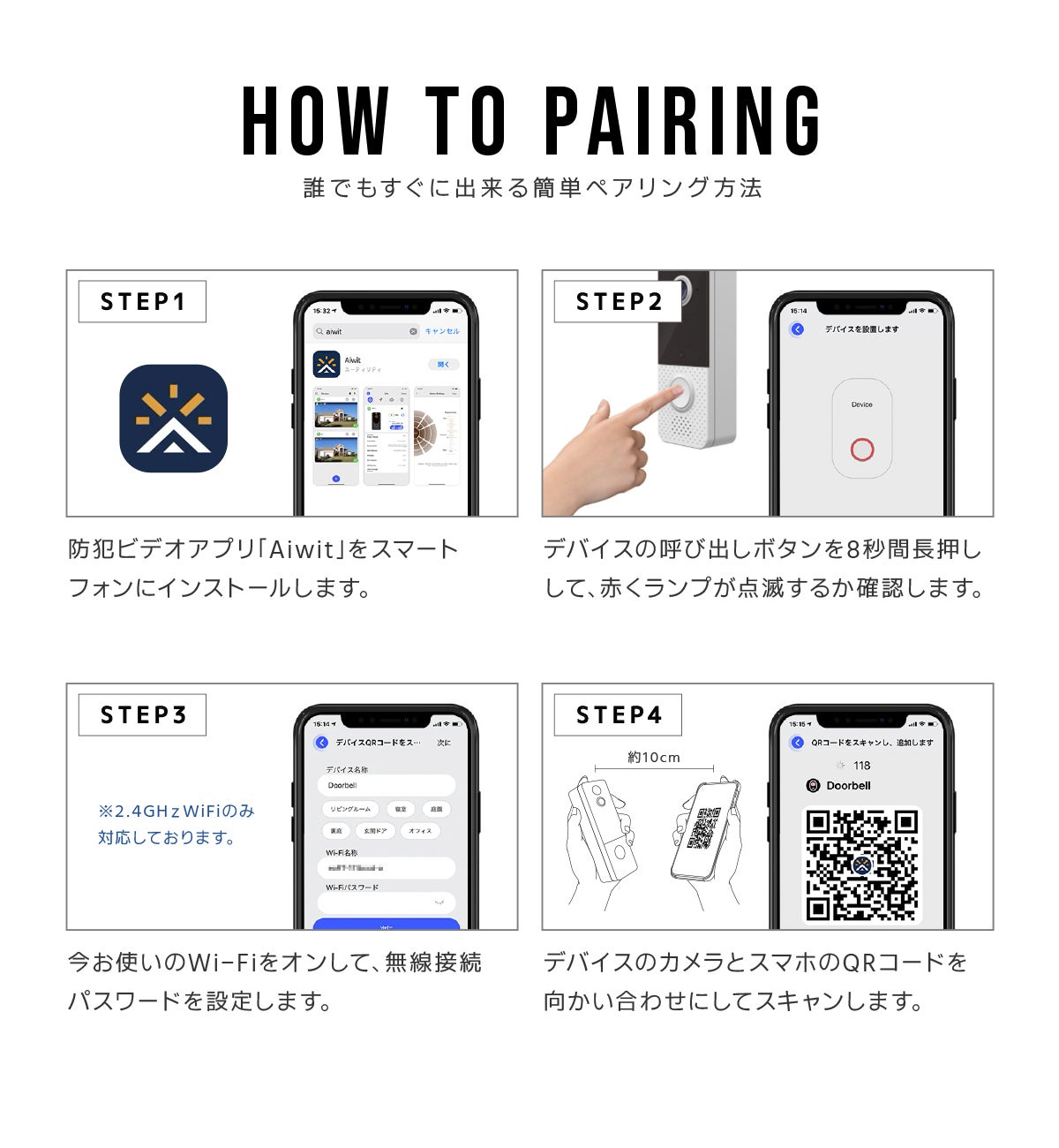 面倒な配線工事不要。日本語対応の専用防犯ビデオアプリ「Aiwit」で簡単に接続できます。