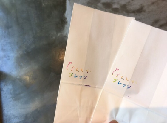 紙袋にスタンプを押しています