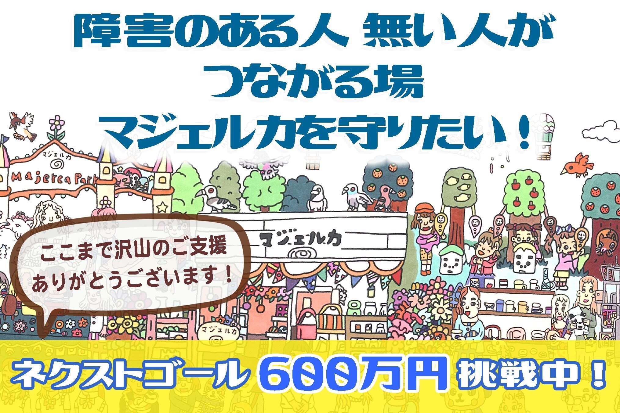 「社会に必要なお店です!」「いつも元気をもらうお店です!」「皆の個性と希望がつまっている場所です!」今回のクラウドファンディングで私たちが得たのは、資金以上に大きな自信でした。沢山の方が今回のクラウドファンディングを機にマジェルカを知って下さり、理念に賛同して下さり、「いつか必ずお店に行きます!」という声をかけてくださっています。利益の追求だけを行わないマジェルカのような事業は、きっとこれからも、沢山の困難に行く手を阻まれることでしょう・・・・でも、なんとしてでも、チーム一丸となって、そしてなによりそのチームの中には、応援して下さる皆様が一緒にいると思えることで、前進していけると思っています!ネクストゴールを設定させていただきました。このクラウドファンディングという大きなパワーで、一人でも多くの方にマジェルカの活動をお伝えし、仲間になっていただければと思っています。あと残り5日。マジェルカの背中を押していただければ幸いです。