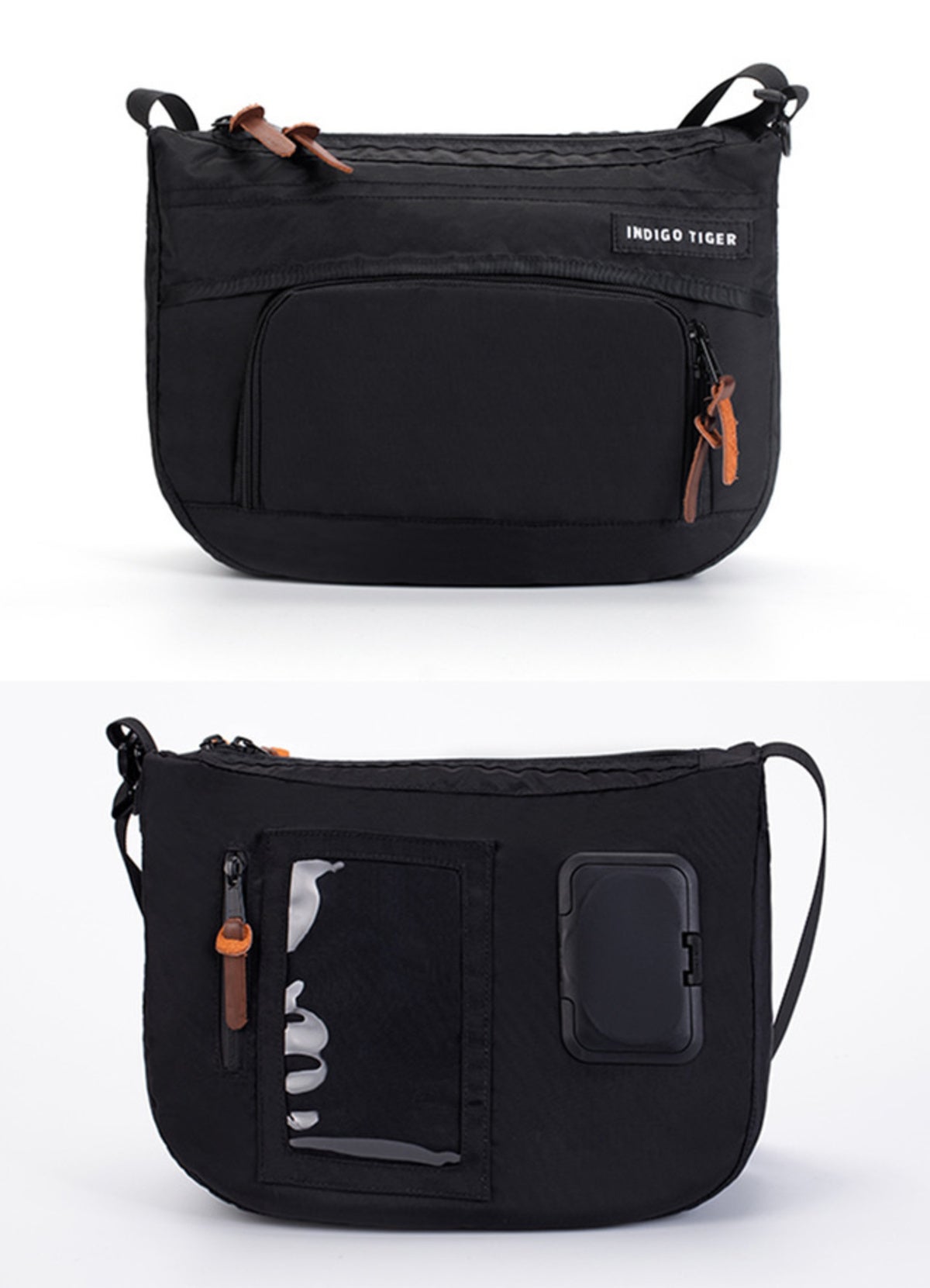 【Smash bag】の表面は財布機能を兼備したフロントポケット、窓付きのスマホポケット、ポケットティッシュとウエットティッシュがサッと取り出せる専用ポケット付き。