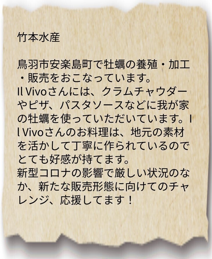 鳥羽安楽島で海の乱開発から美しい海を守るために牡蠣の養殖をしています竹本水産さんは、スケジュールが合わなくてお会い出来なかったのですが、メールで下の様な応援メッセージを頂きました。