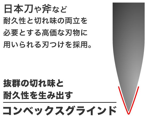 コンベックスグラインド(ハマグリ刃)とは、刃付けの形状を言います。刃に向かって緩やかなカーブを描いてそのままエッジに行き当たる刃付けとなっており、日本刀や斧など、耐久性と切れ味の両立を必要とする、比較的高価な刃物に用いられる刃付けです。 石を使った仕上げは職人技で非常に難しいのですが、専用のシャープナーを使うと、職人技の研ぎをいとも簡単に行うことができます。