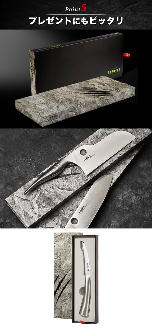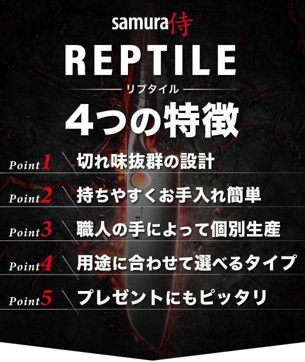 このSamuraリプタイル ナイフは伝統的な精製方法と現代技術の精密な計算を取り入れて設計、開発された今の時代の包丁です。