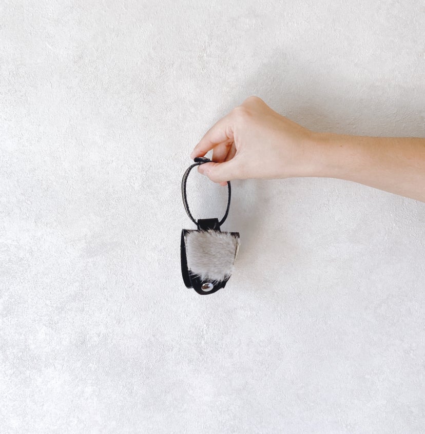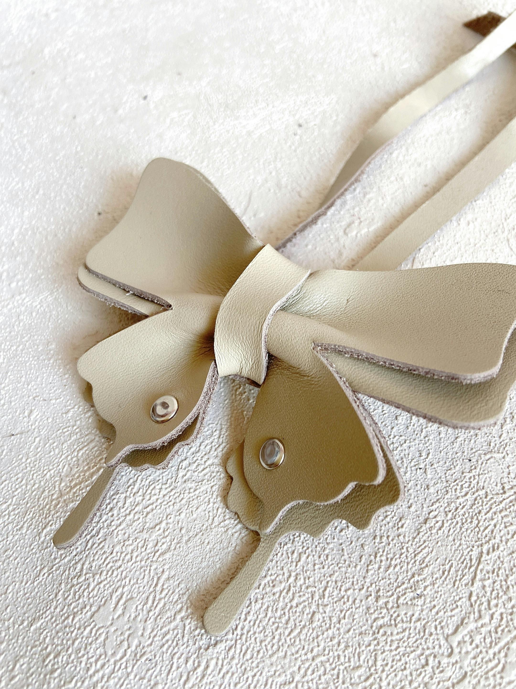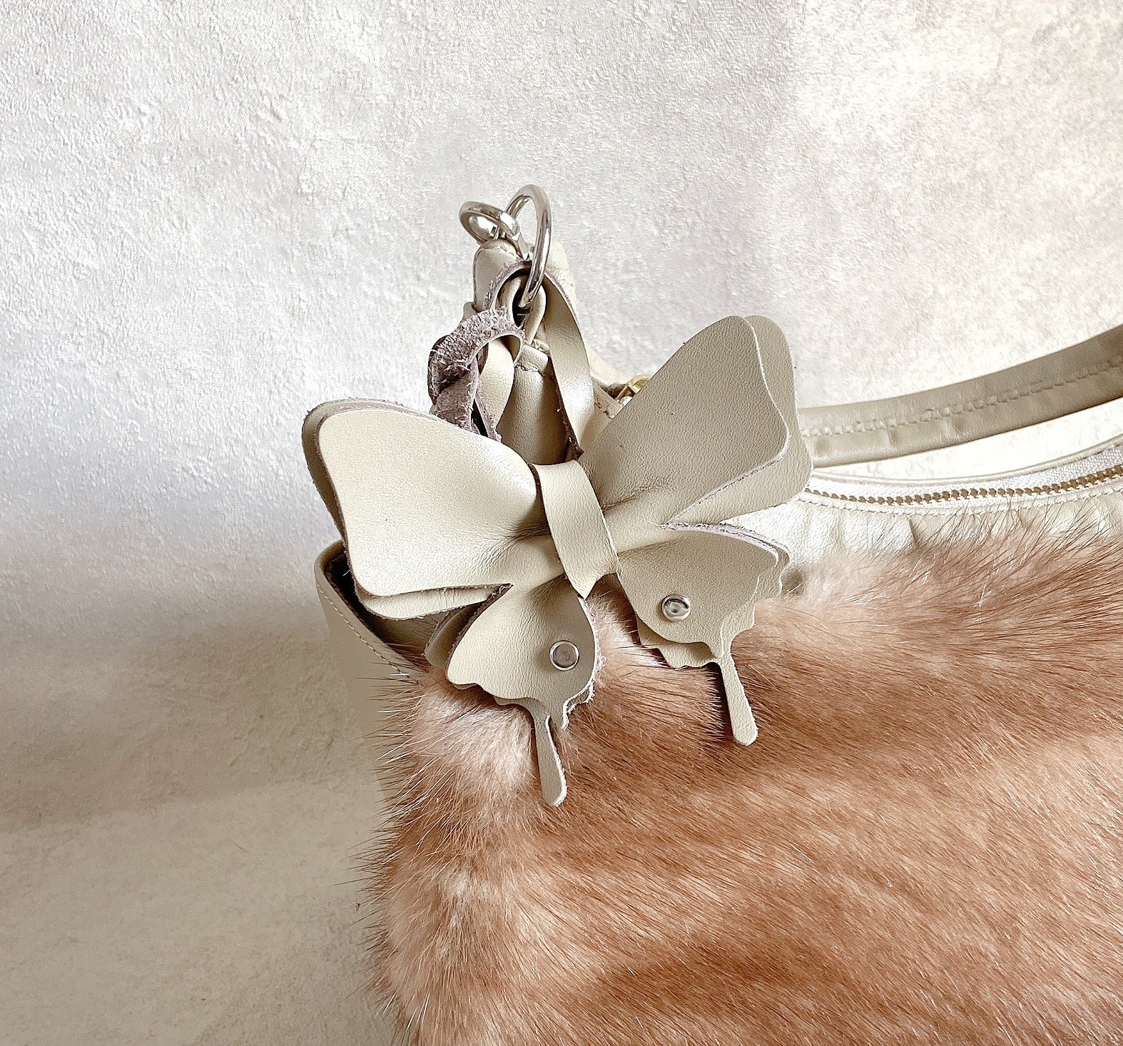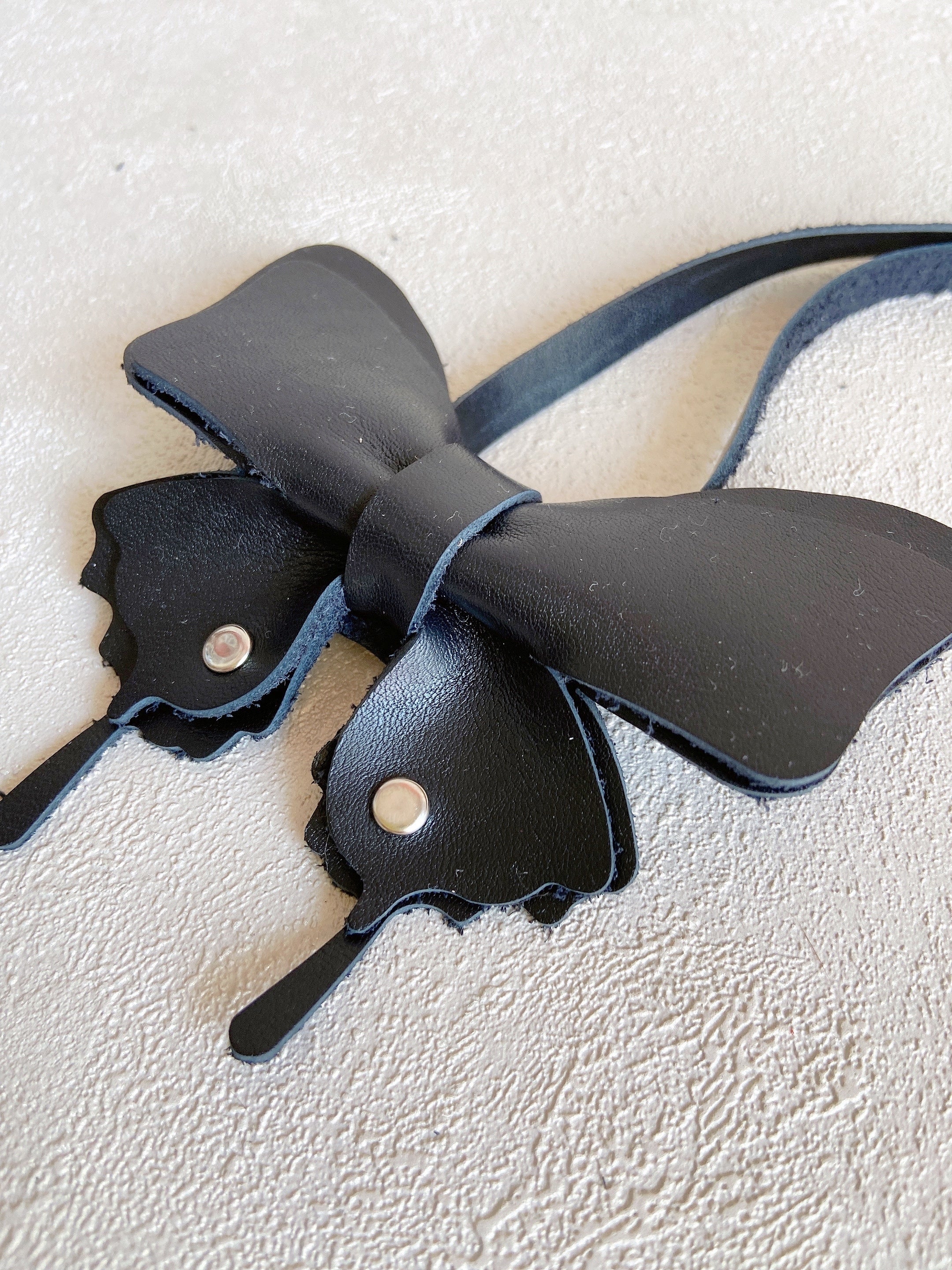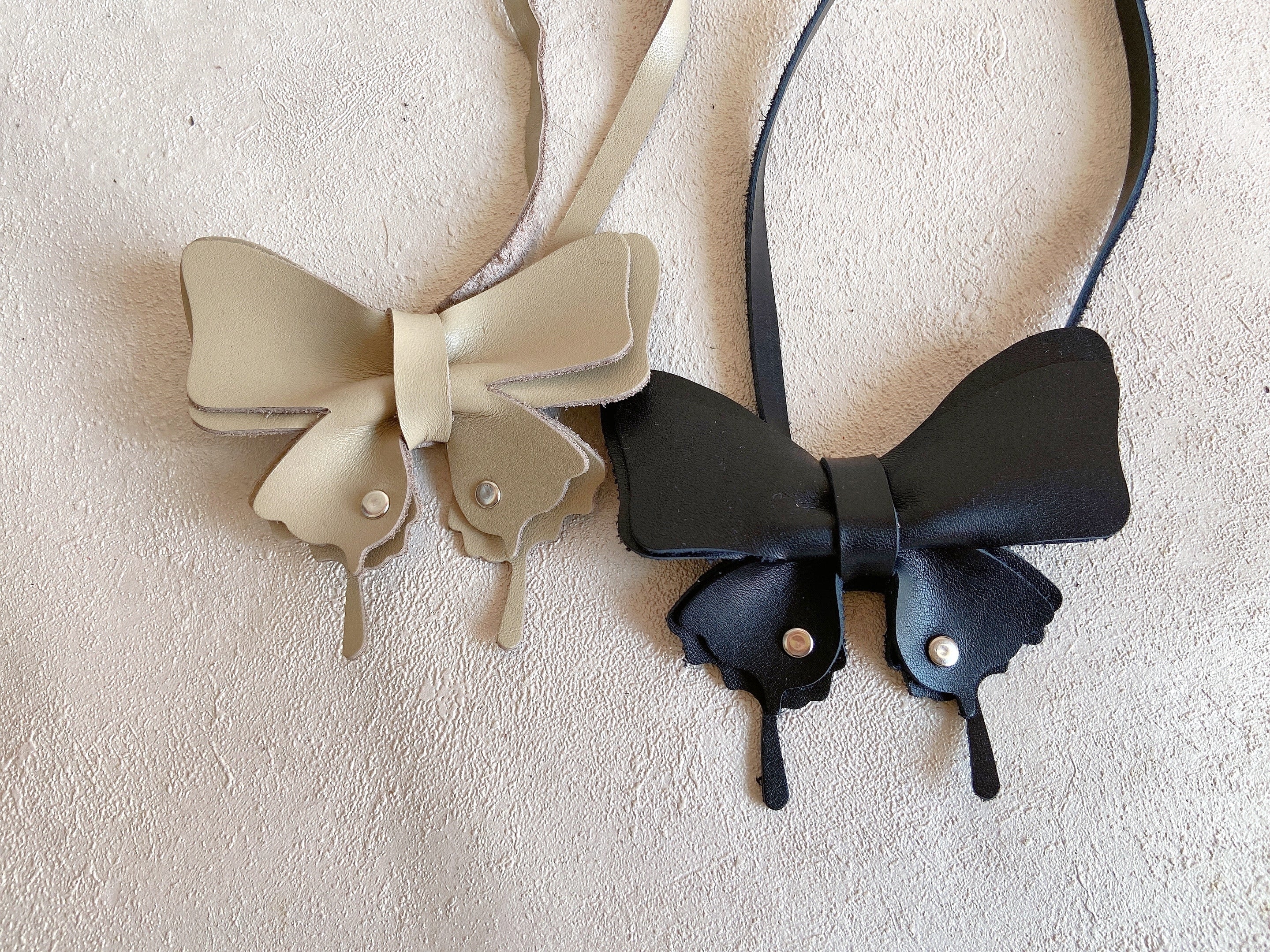 セカンドブレイブがこのクラウドファンディングリターン作品のために作ったオリジナルレザーのオーク牛革と、ブラック牛革でバタフライチャームを作りました。