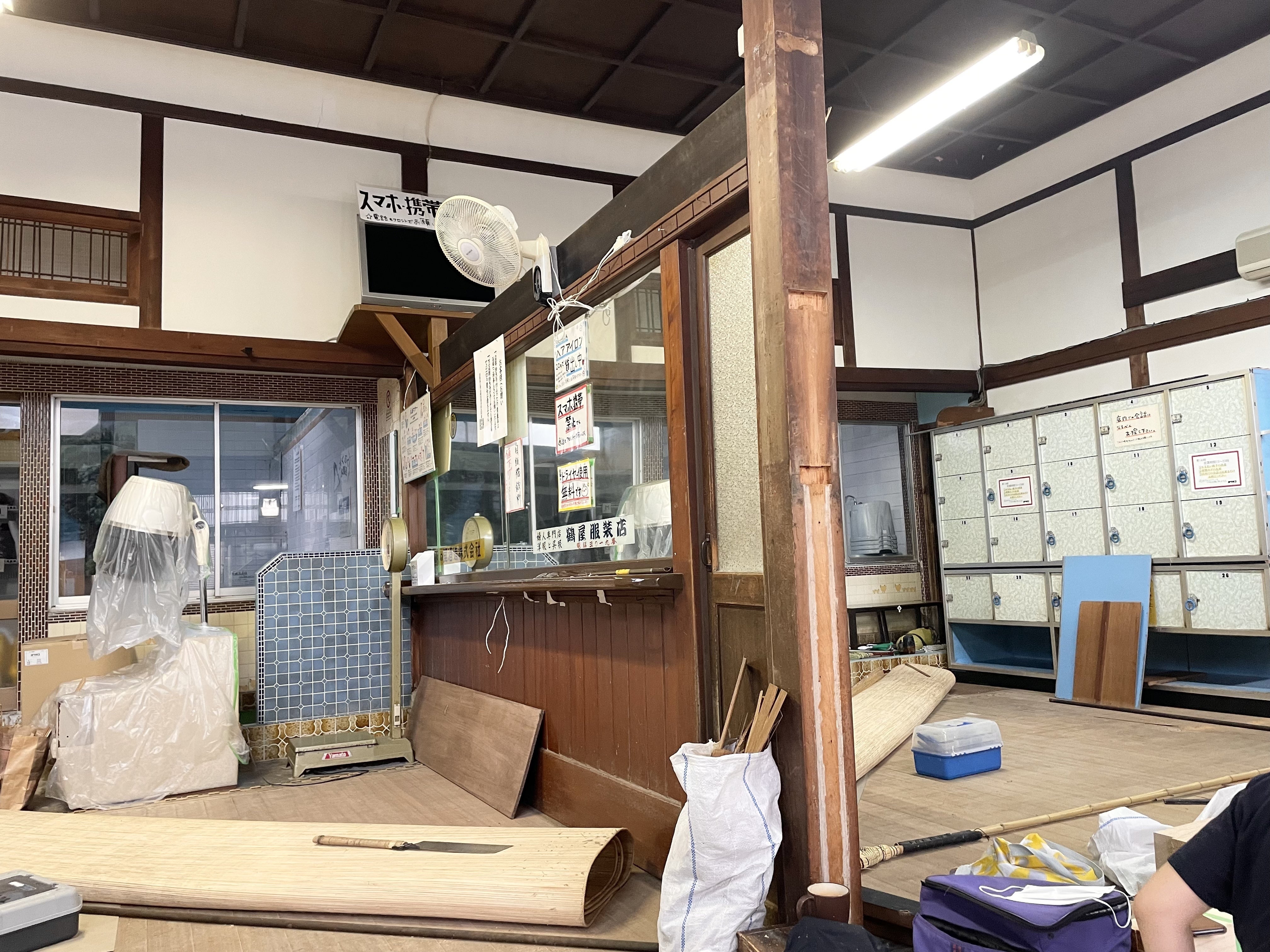 そんな中、建物の躯体部分(柱)の補強と、それに付随した手洗場の一新が必要であることが判明しました。どうせ大掛かりな工事をしなければならないなら、と言うことで、いつの日かと構想していたフロント部分の大改装に踏み切りました。ゆとなみ社が得意とする新しい取り組みをするには狭すぎるフロントを広くして、コロナによる集客減少や密な空間を解消しようというものです。