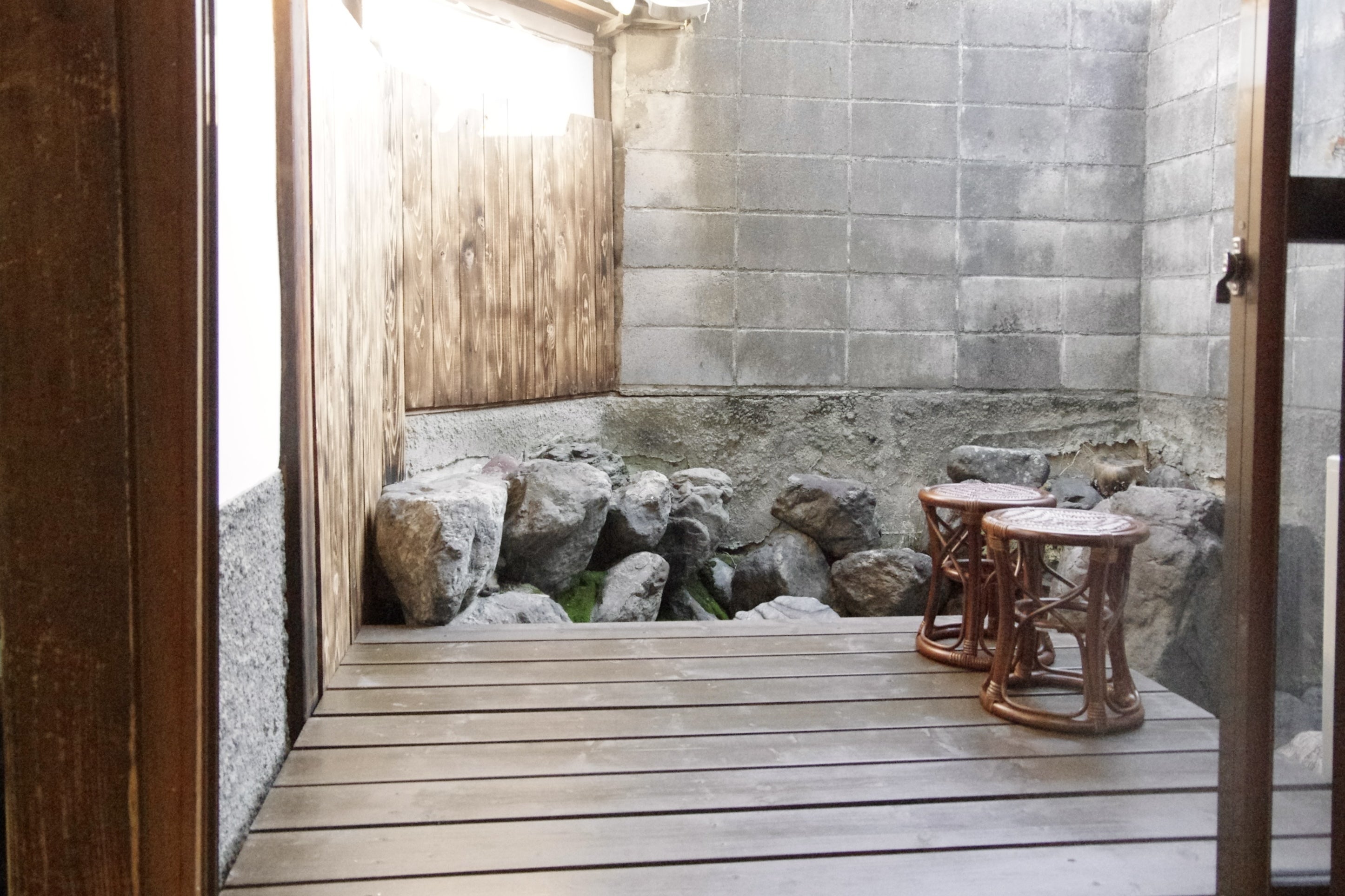 また、40年程使われていなかった庭を有効活用するために、ウッドデッキを設置しました。こちらは、工事費を少しでも削減するために、容輝湯の番頭とスタッフで手がけました。