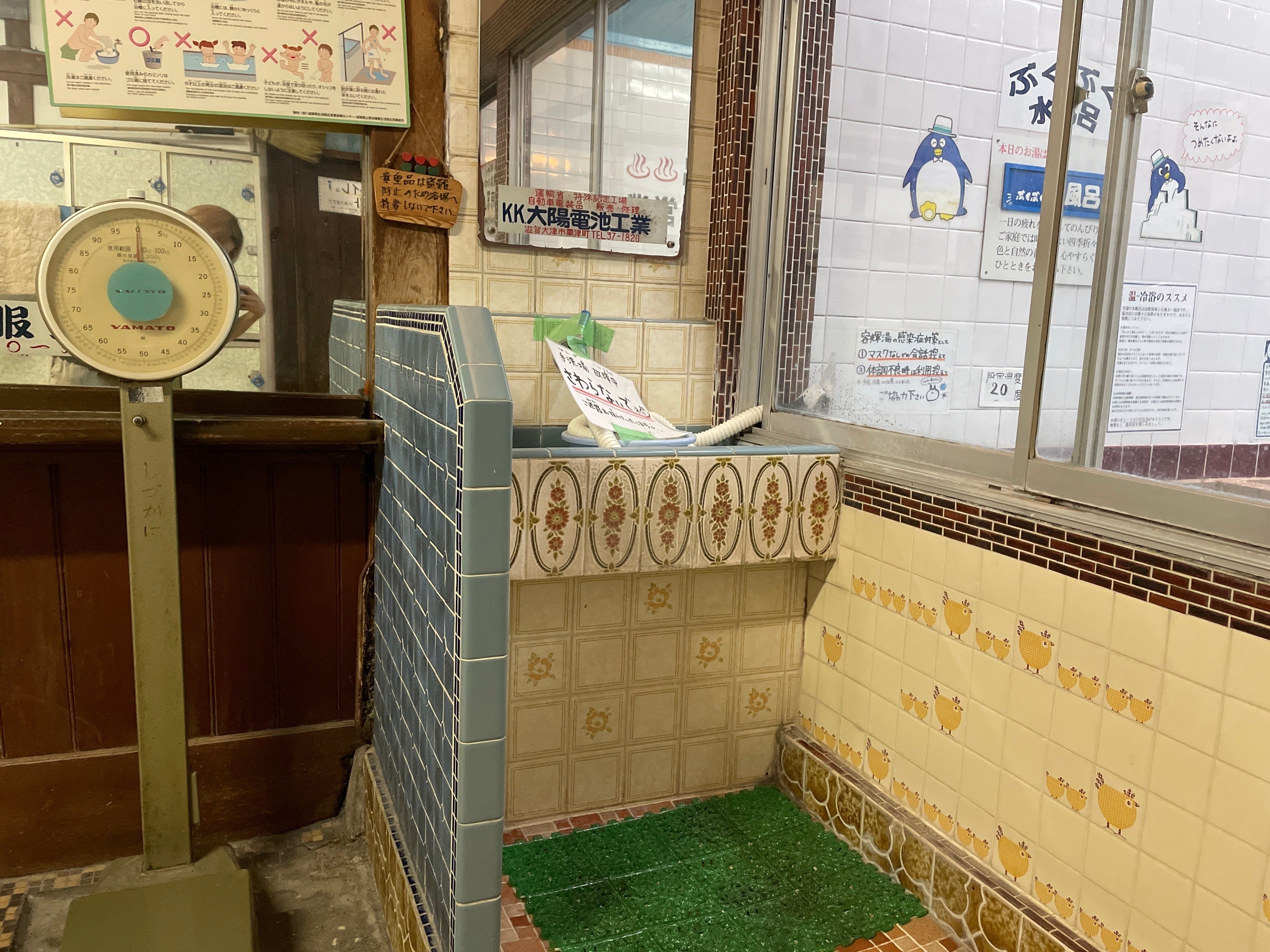 令和に行った改装とは思えない昭和な雰囲気に満ちた空間ができあがりました。元々あった脱衣場の扉や他の銭湯で使われていた番台や下駄箱を再利用して、細部にもこだわりました。