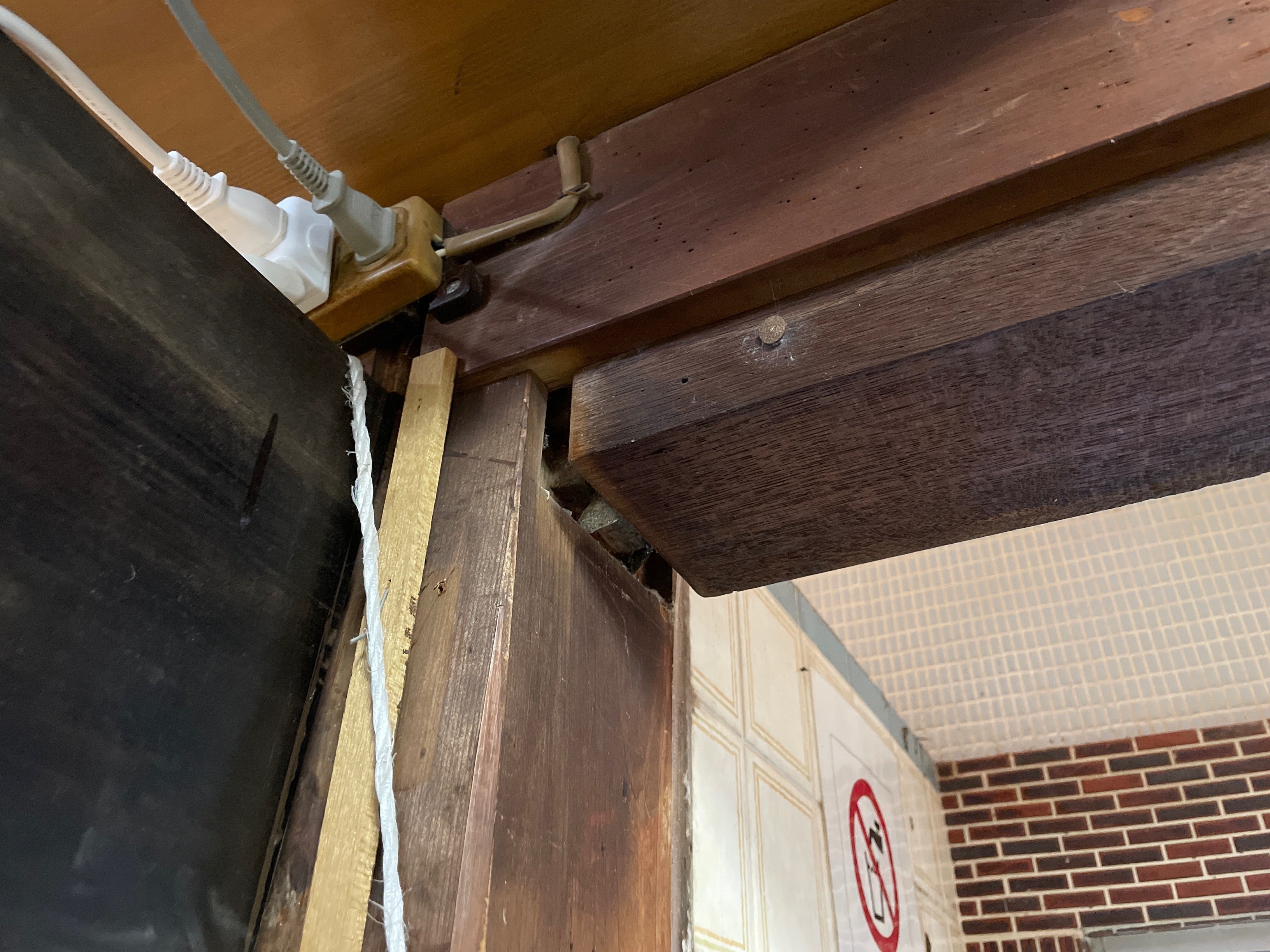 柱の根元が腐り、柱が沈んできた事によって梁が落ちてきている