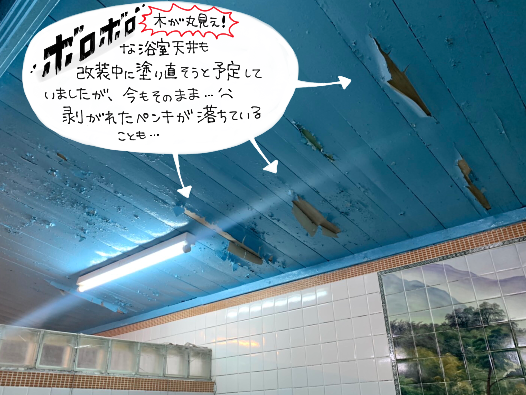 手洗い場から水が漏れて腐ってきている柱最近になって剥がれが目立ち、お客さんからも「早く塗り直してや〜」と言われていた「浴室天井のペンキ」。塗り替えも予定していましたが、予算の都合上断念。