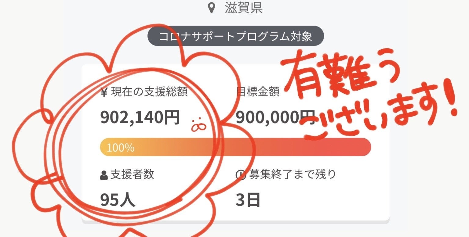 みなさま本当に有難うございます!終了3日前に目標金額90万円を達成致しました!お一人お一人の力が積み重なり、達成まで来る事が出来ました。本当に有難うございます。(感動で本当に震えています)