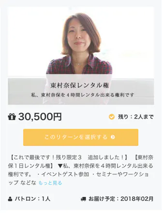 2017/12/27 13:32本日、クラウドファンディング最終日ですが、なんとなんと!和歌山県日高郡美浜町の「ふれあいと健康と起業のまち創生協議会」さまより、「東村奈保レンタル権」ご購入いただきました。全く面識のない団体様なのですが、クラウドファンディングの内容に興味をもっていただき、ご連絡をいただきました。 美浜創生総合戦略の都市公園隣接地のリニューアルの整備・行動計画の中に、シェアキッチンやシェアスペースに関しての構想があるようで、東村レンタル権で講義をお願いしたいとのことでした。私なんかでいいのかと、かなり恐縮ではあるのですが、これも何かの縁、そして新たな挑戦として、お受けしたいと思います。「東村奈保レンタル権」、これで5件のご購入がありました。利用方法は様々ですが、ご利用いただいた方の何か次の一歩になるような、そんないい時間になればいいなと思います。ありがとうございました。 もっと見る