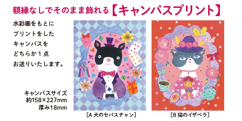 水彩画をもとにプリントをしたキャンパスを[A犬のセバスチャン][B猫のイザベラ]
