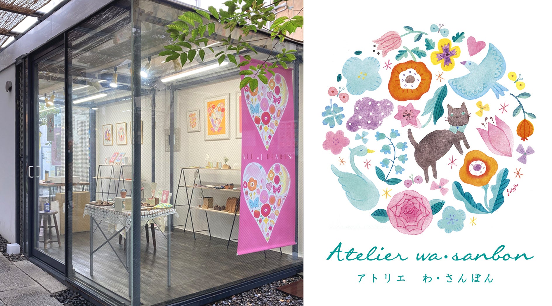 アトリエわ・さんぼんのショップロゴイラストがデザインされた