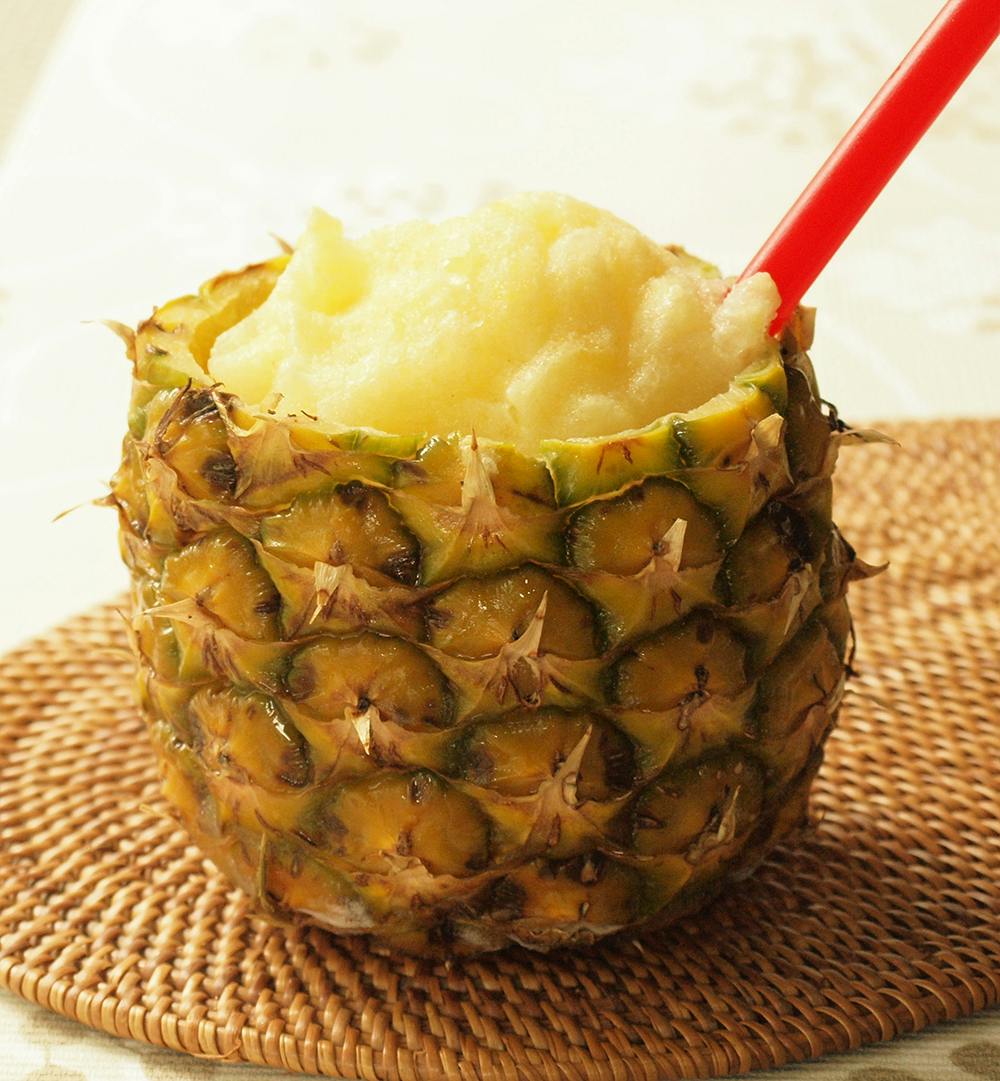 「器のパイナップルはカッチカチに凍らせて!」 スムージーには冷たい器で!中のスムージーが溶けにくいです! 冷たいままながーく美味しく味わえます。
