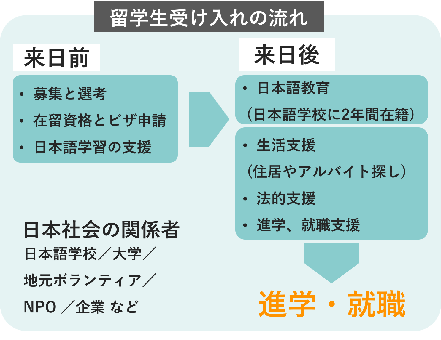 留学生らは、来日直後から週28時間以内のアルバイトによって生活費を賄いますが、渡航費用、日本語が上達するまで半年間の住居費補助、定期的な進路指導とカウンセリングなどの費用が必要です。