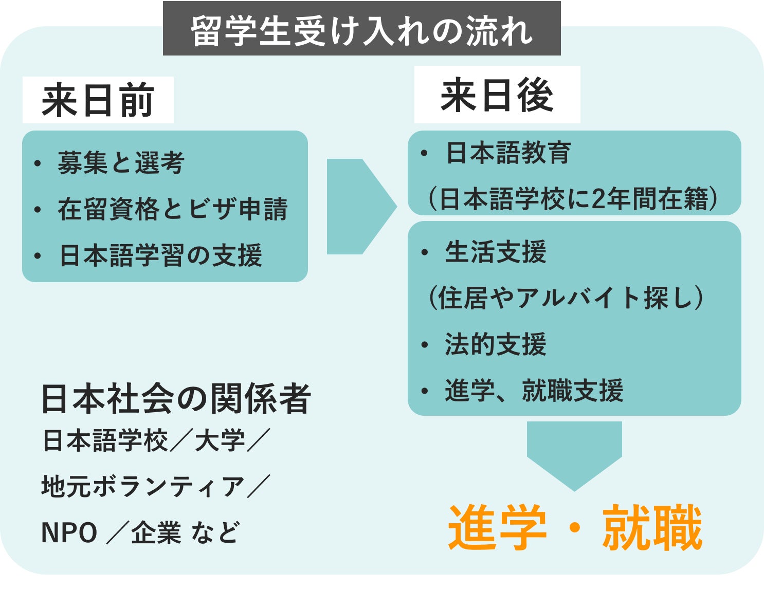 渡航費、採用費、事前日本語学習費、来日前後オリエンテーション実施費、半年間の住居費支援、社会統合支援費、大学受験準備支援費、進路カウンセリング費、管理費(最大10%)