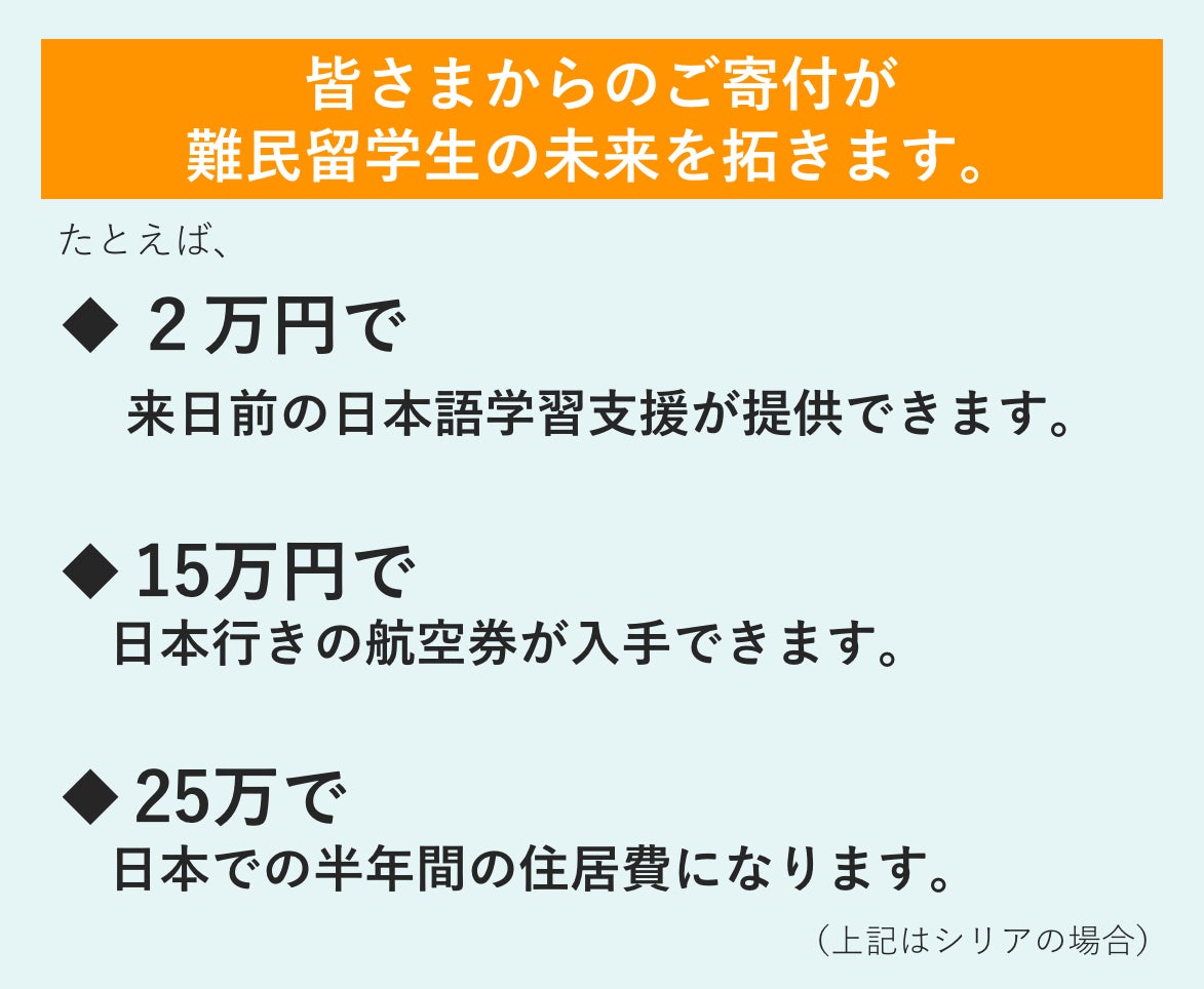 皆様からのご寄付は、確実に留学生たちの受け入れや日本での生活の立ち上げ、そして将来の夢の実現につながります。一人でも多くの方々にご支援いただき、皆様と共に、難民となった若者に新しい道筋を提供することができれば大変幸いです。
