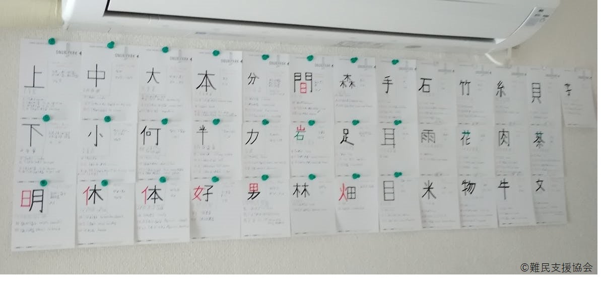 シリア人留学生の部屋の様子。来日して3カ月後に訪問したところ、日本語学校で学んだ漢字を壁に貼り出して覚えていた。