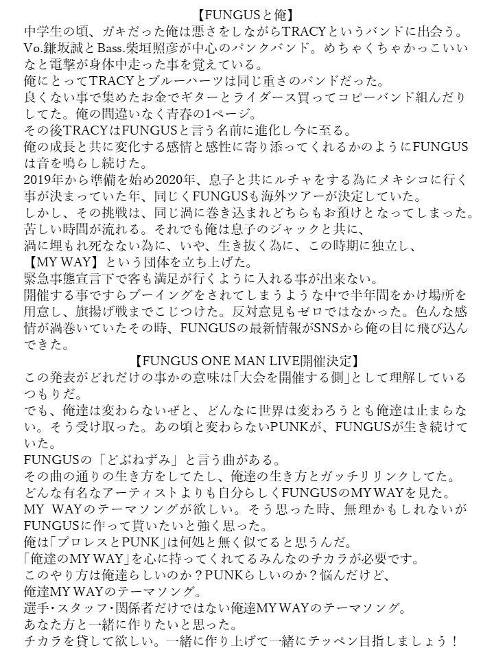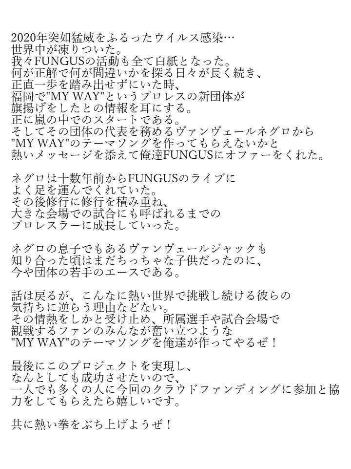 プロレス団体MY WAYのテーマソングをFUNGUSが作詞作曲するプロジェクトを現在進行しております!