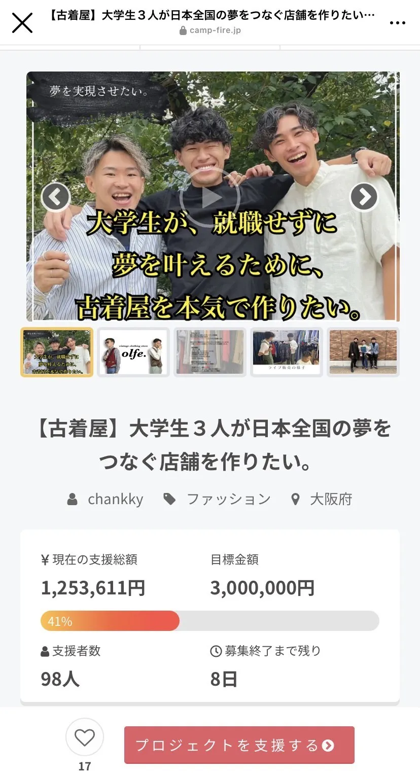 クラウドファンディング支援金額が100万円を突破しました!