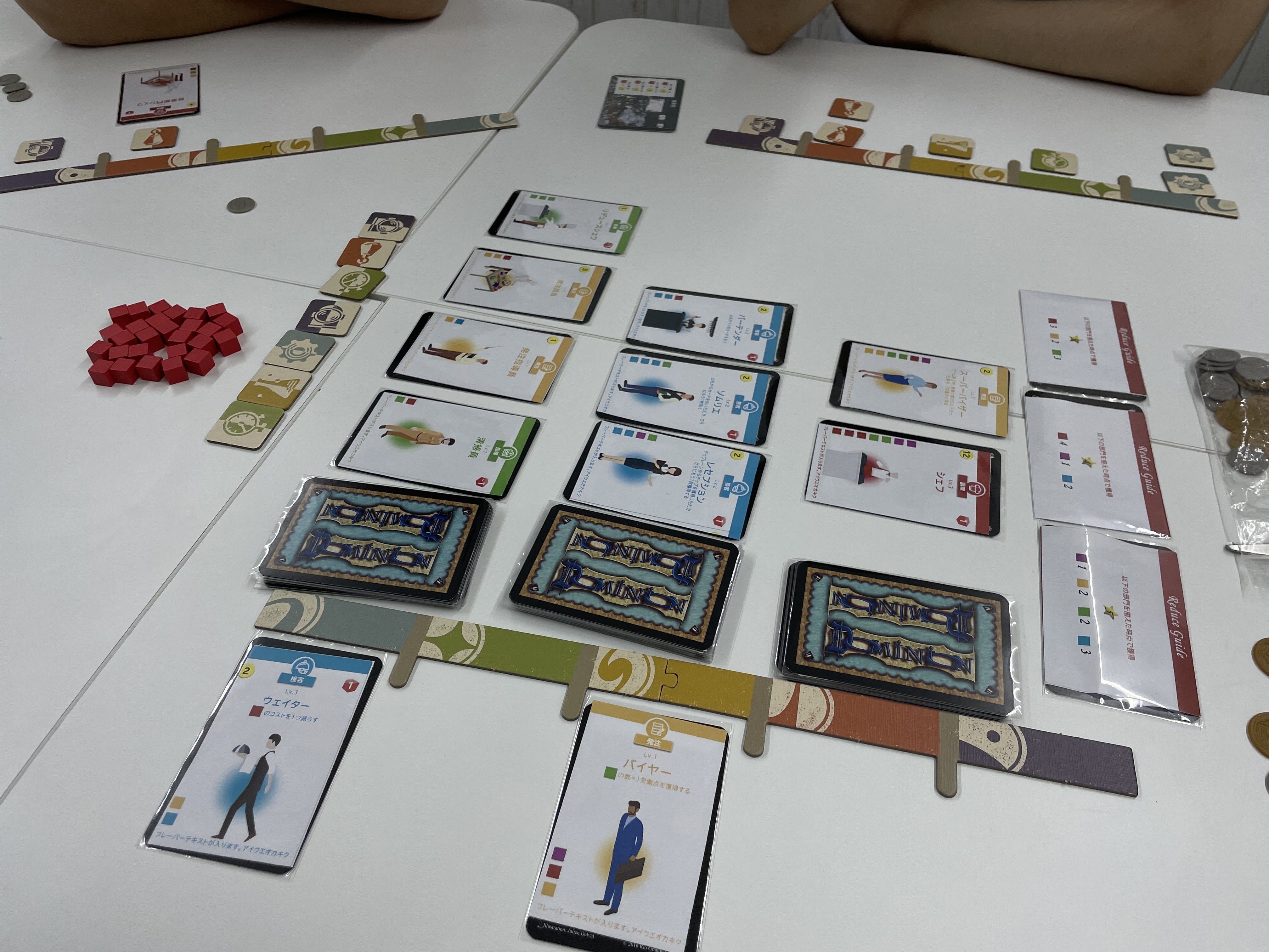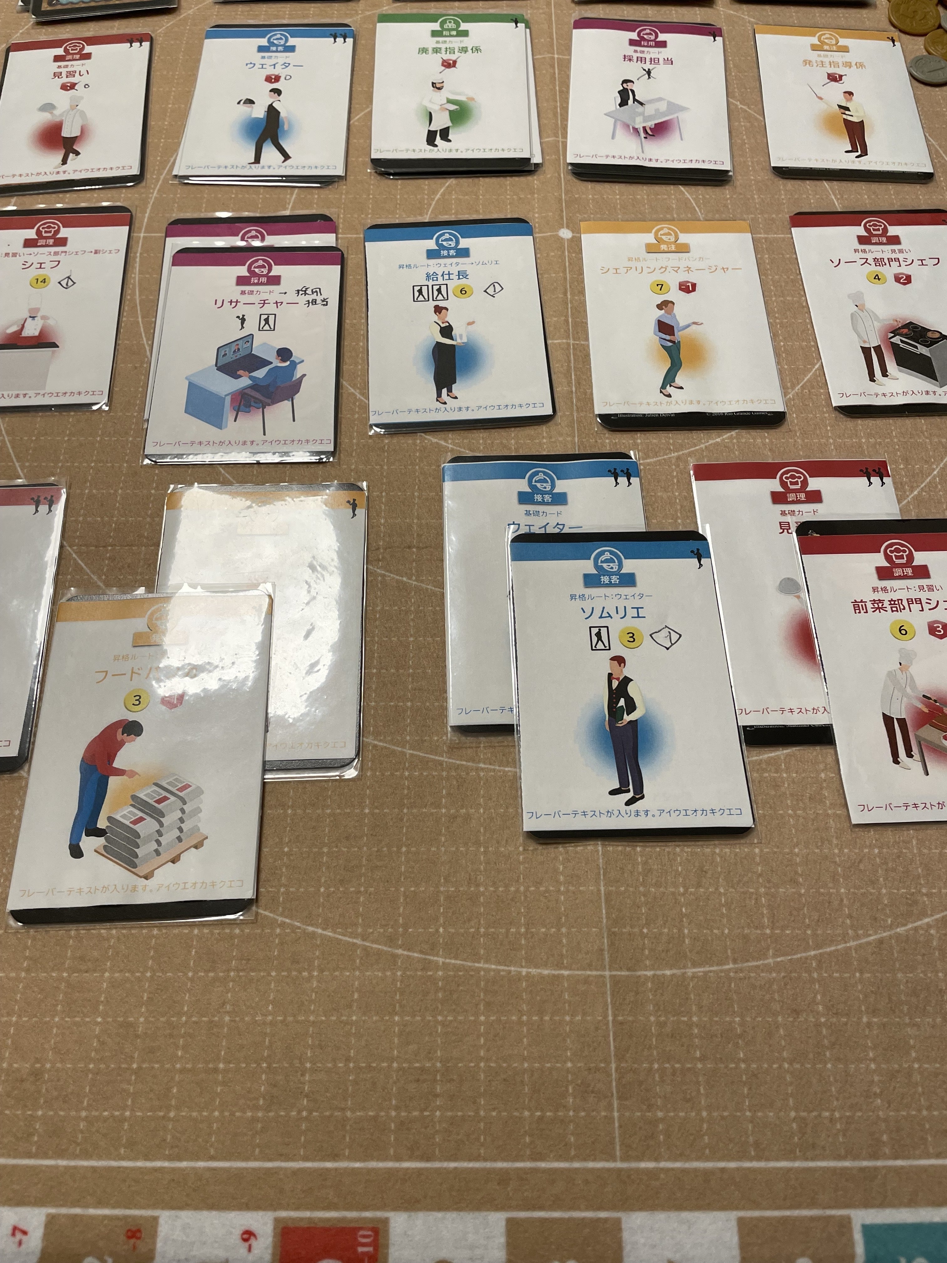また、「スタッフを昇格させてみる」「資源をプレイヤー同士で交換させてみる」「スタッフの採用条件を付け加える」など、色々な試みも加えながら進めていましたが結果的には余計なエッセンスになってしまったので全てボツになりました。バランス調整もそうですが、ここらへんの要素の足し引きも「どういうゲームにしたいか?」と立ち戻って考えたときに合わないものは入れるべきではない、という判断になりました。