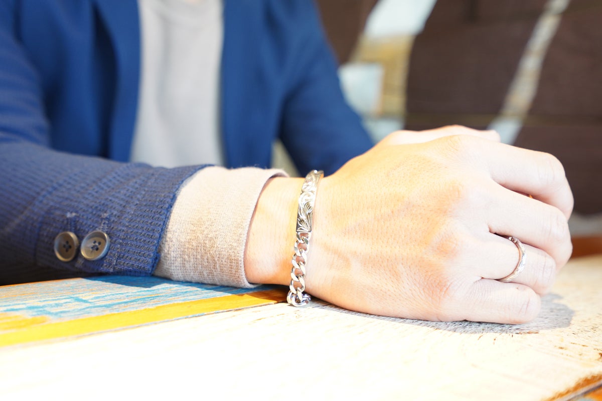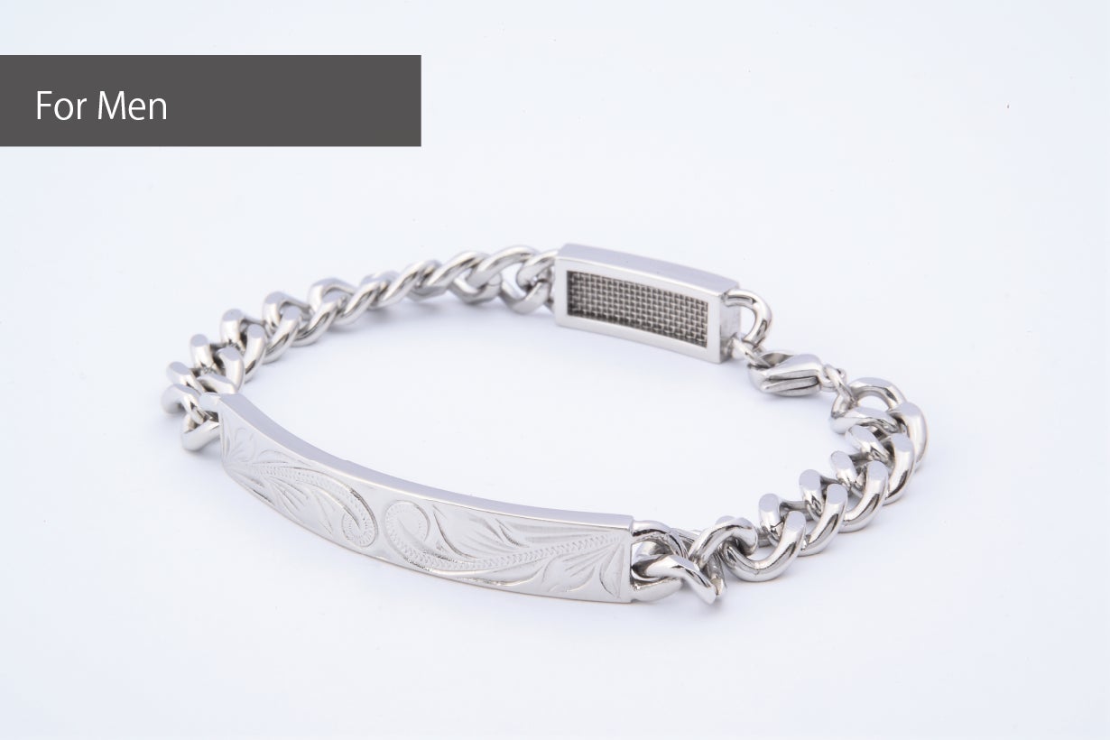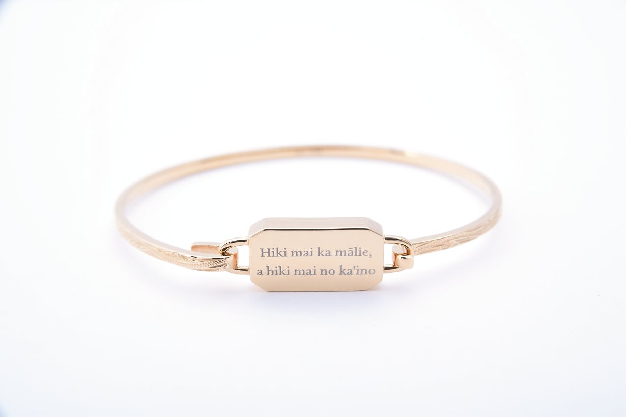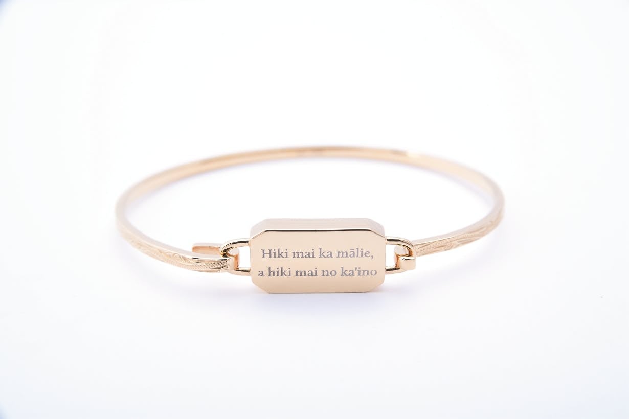 女性用は細身のブレスレット部分にスクローデザインを取り入れ、プレート部分には、幸せをもらえるハワイ語のフレーズ付き。