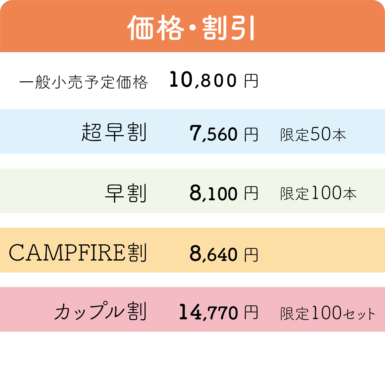 一般小売予定価格が10,450円(税込)に配送料350円(全国一律)を加え、10,800円からの各割引となっております。最大で約30%引き、CAMPFIRE限定の大変お得な価格です。