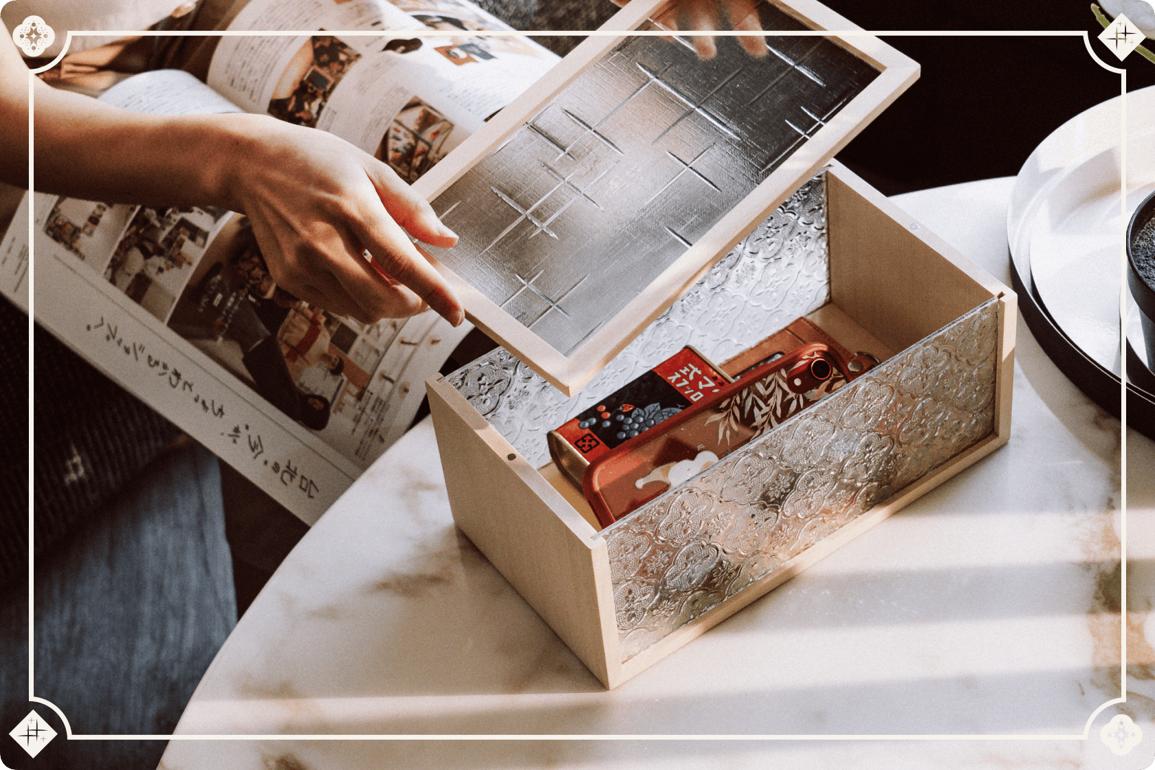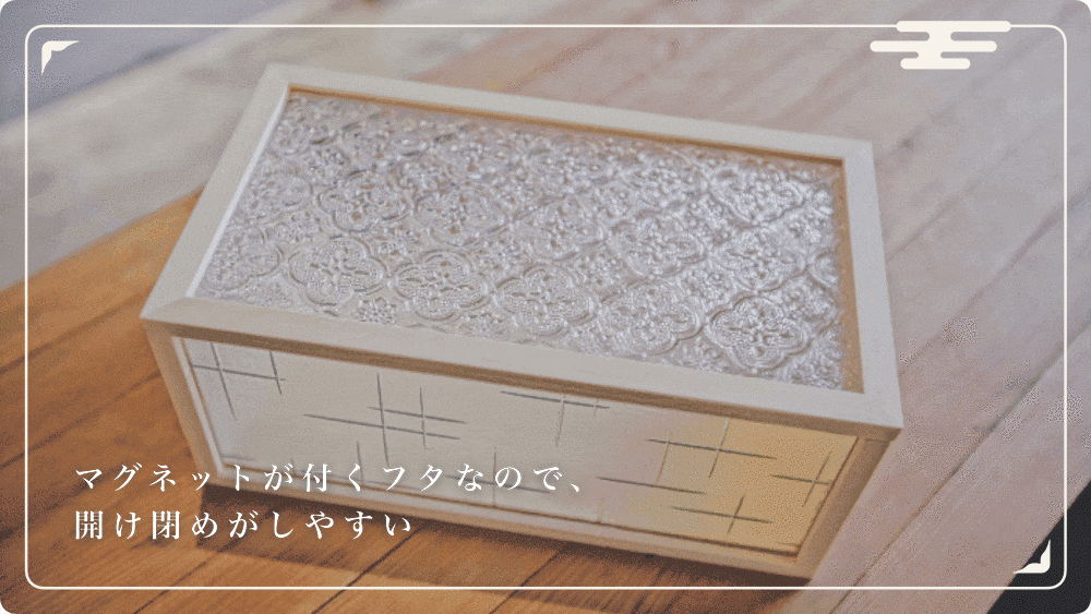 【ガラスと組子細工が施された収納ケース】マグネットで開閉する蓋なので、横置きか縦置き、自由変動が可能です。またサイズも大きいため、日用品(文房具、化粧品など)を簡単に収納することができます。また蓋はガラス(2種類)、木の全3種類からお好きな柄をご選択いただけます。
