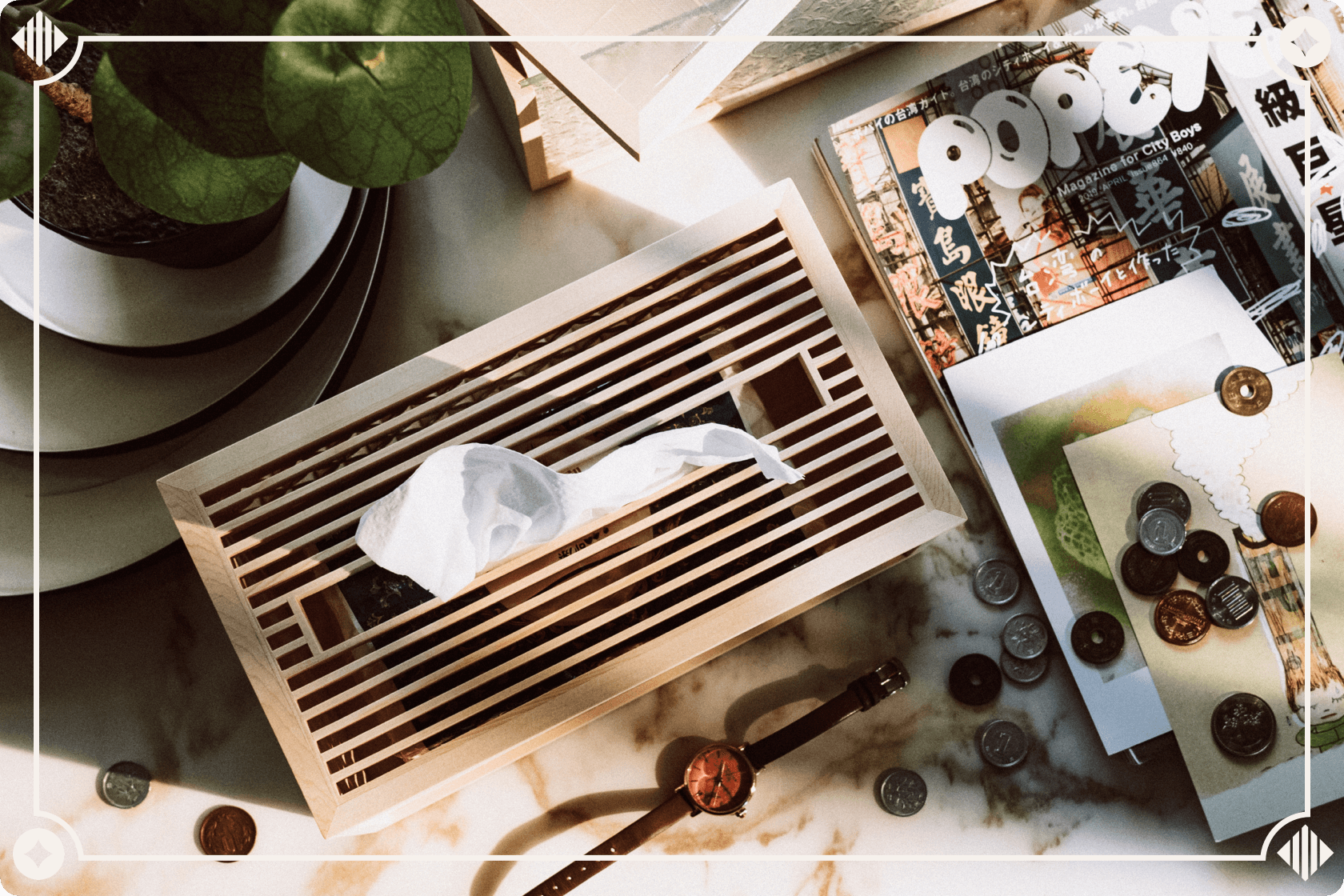 【ティッシュケース】マグネットで開閉する蓋、大口径で取り出しやすさなど「現代的」な機能美も兼ね備えています。