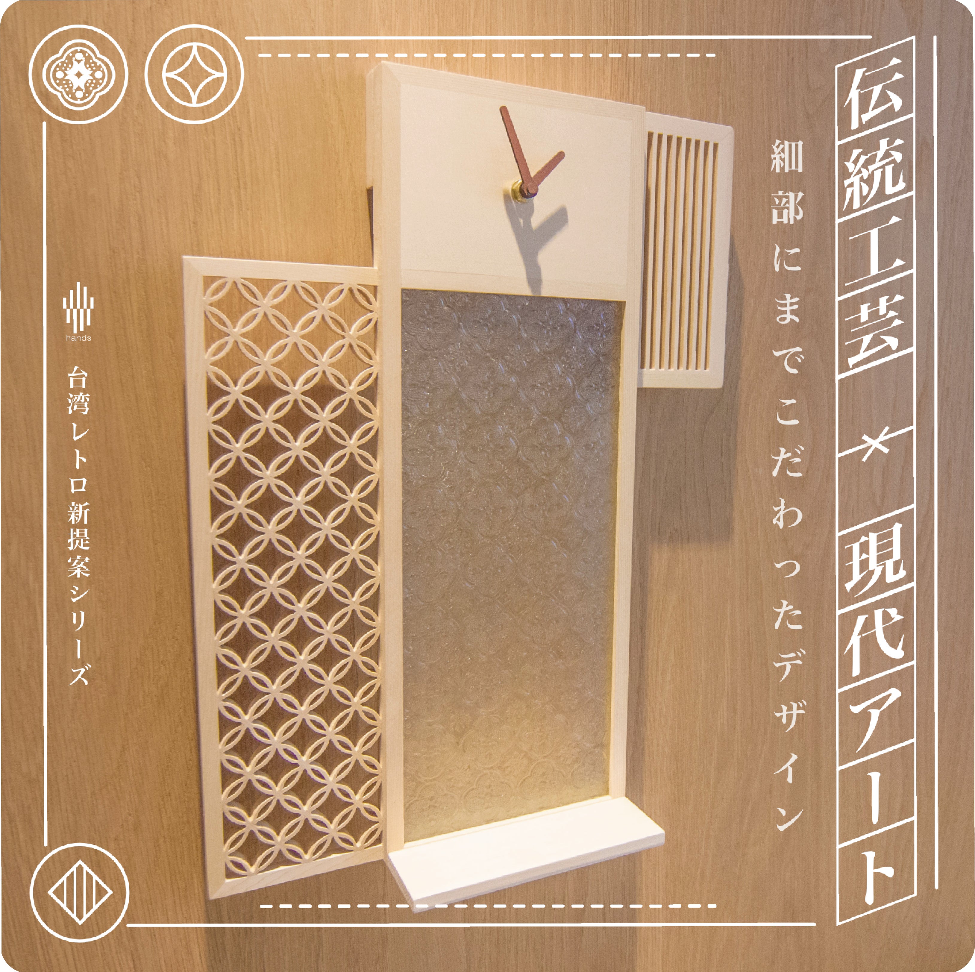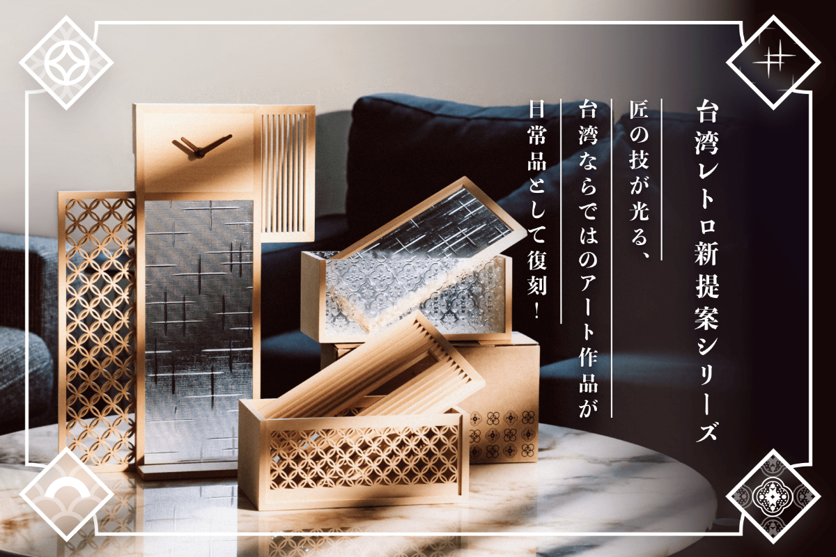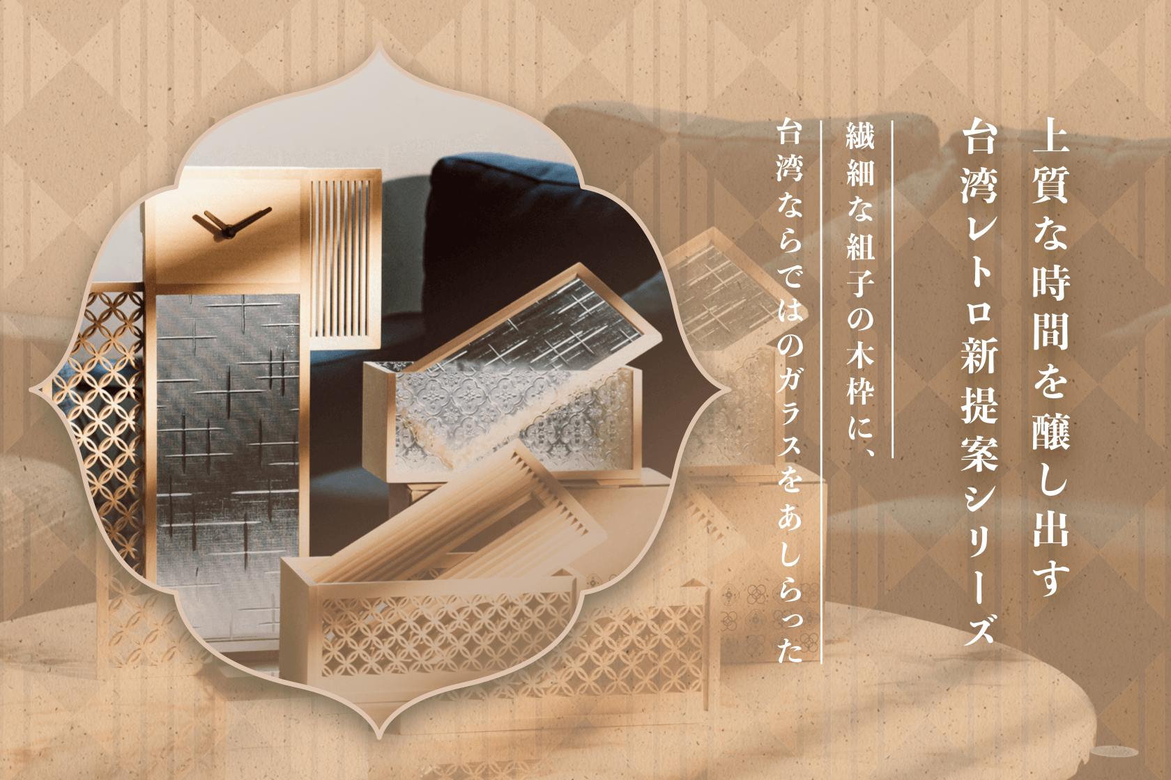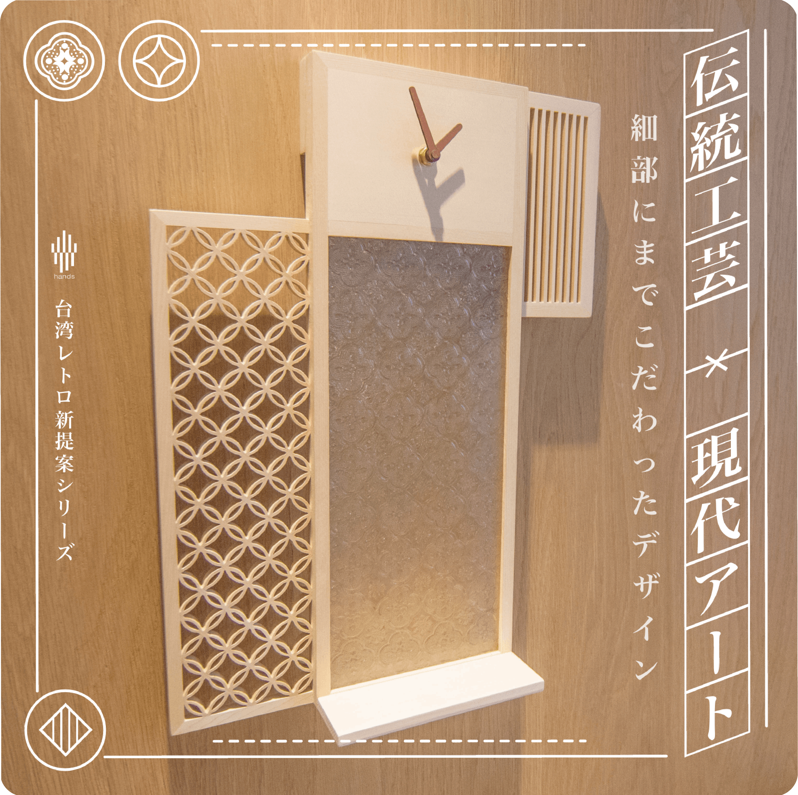 立ち上げを手がけるのは新進気鋭のクリエイティブブランド「Hands」。台湾職人の技術を「掛け時計」、「収納ケース」、「ティッシュケース」といった日常で使用できるアイテムとして復刻しました。繊細な組子の木枠に、台湾ならではのフローラガラスをあしらった三種類、暮らしの質より一層引き立たせてくれます。