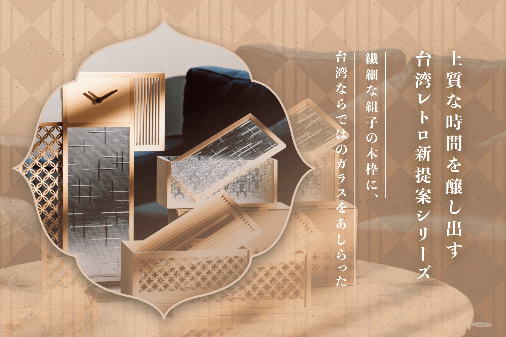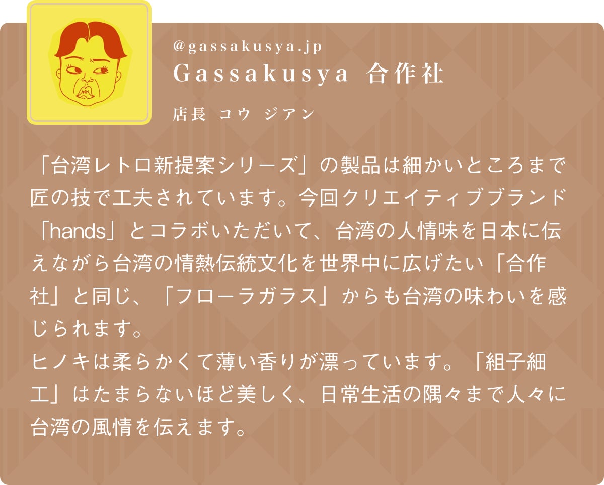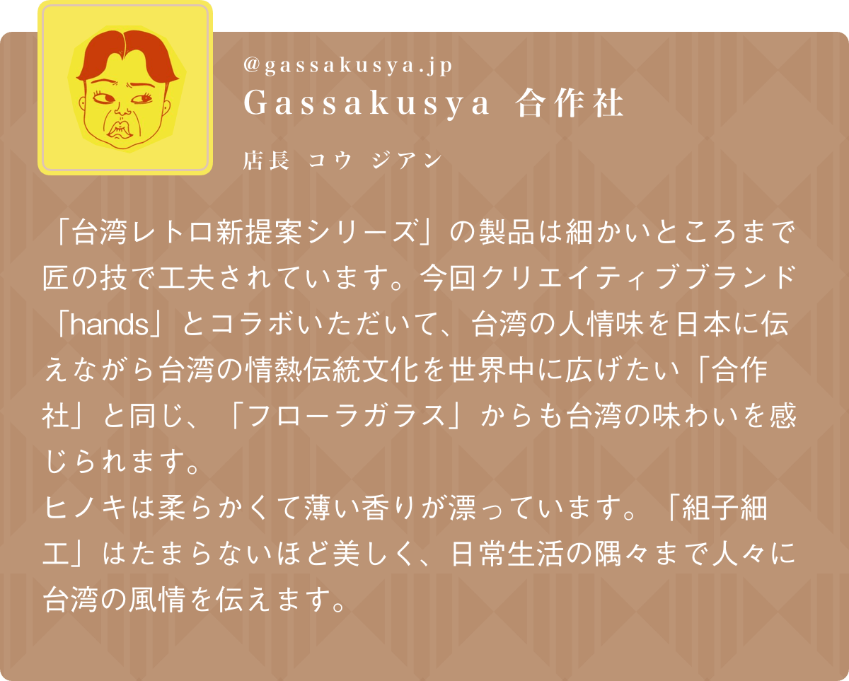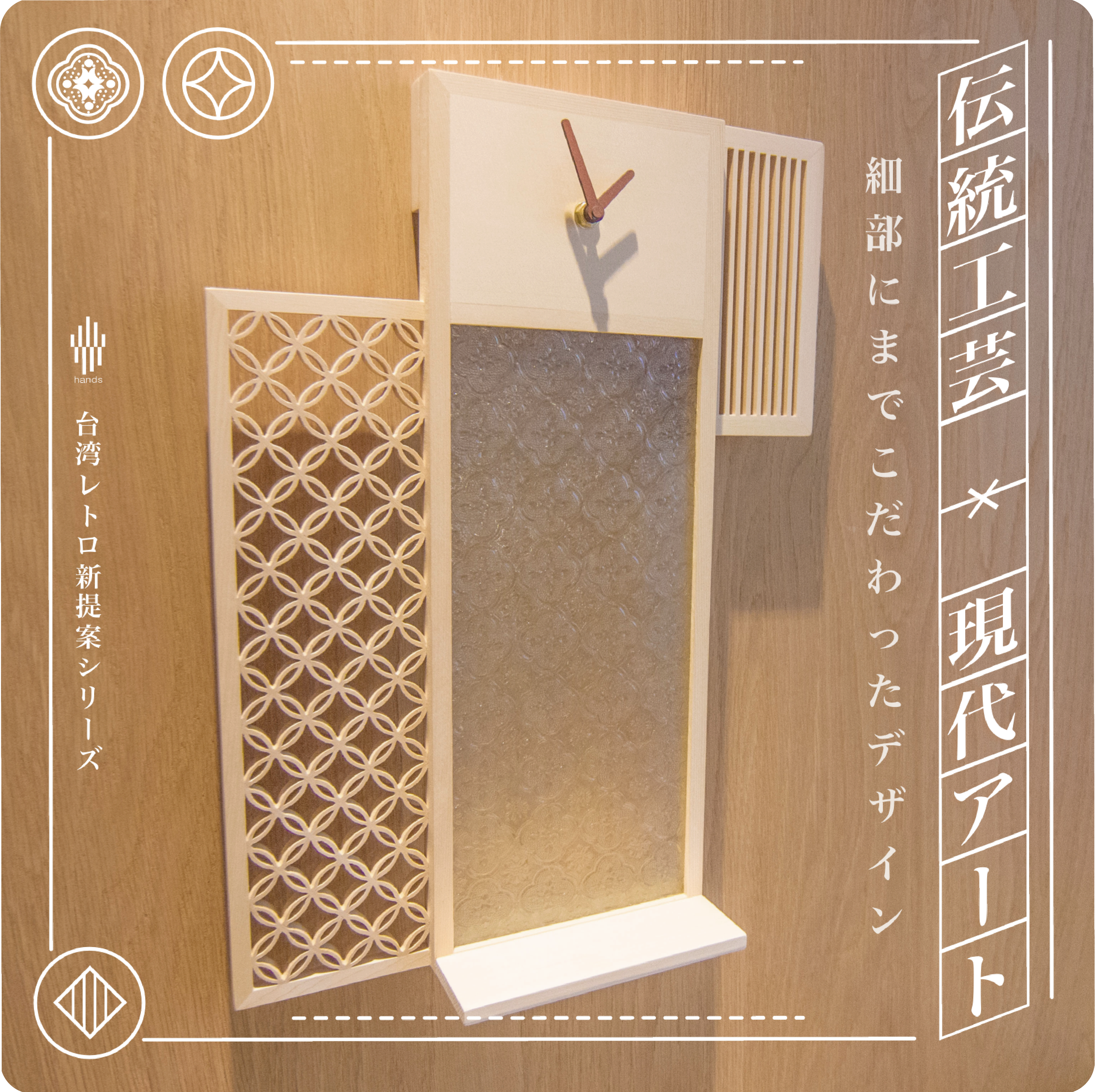 立ち上げを手がけるのは新進気鋭のクリエイティブブランド「Hands」。台湾職人の技術を「掛け時計」、「収納ケース」、「ティッシュケース」といった日常で使用できるアイテムとして復刻しました。繊細な組子の木枠に、台湾ならではのフローラガラスをあしらった三種類、暮らしの質より一層引き立たせてくれます。