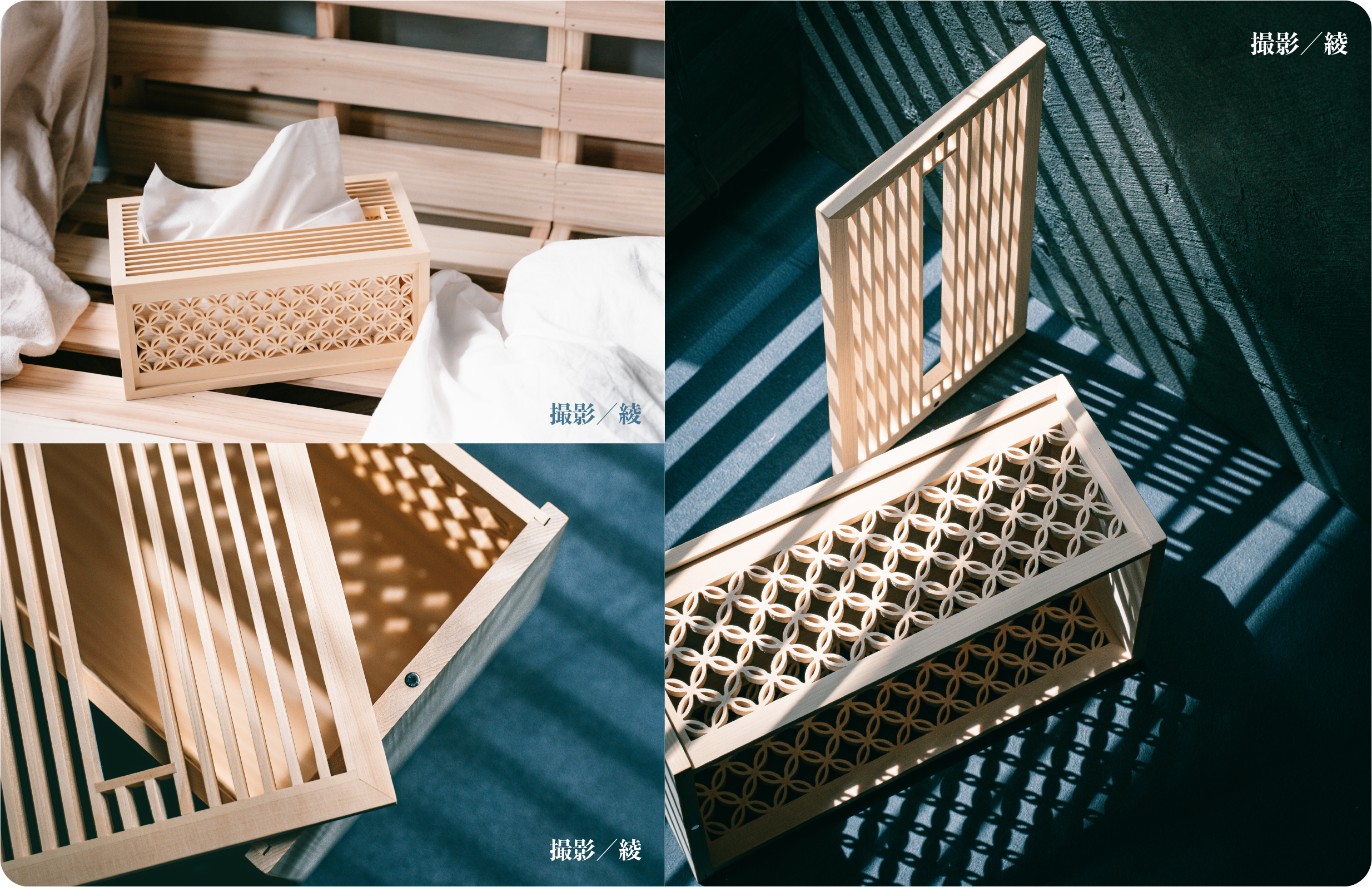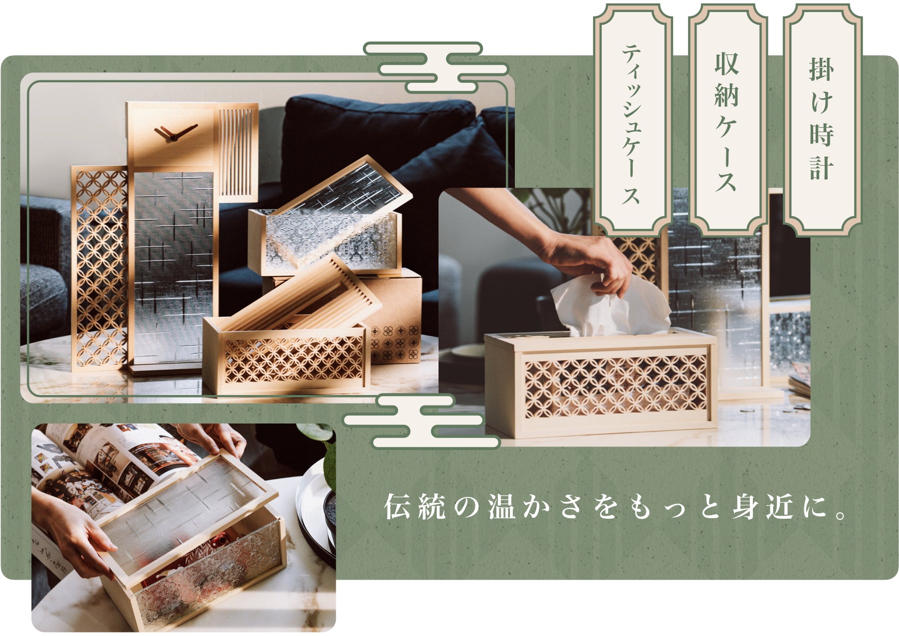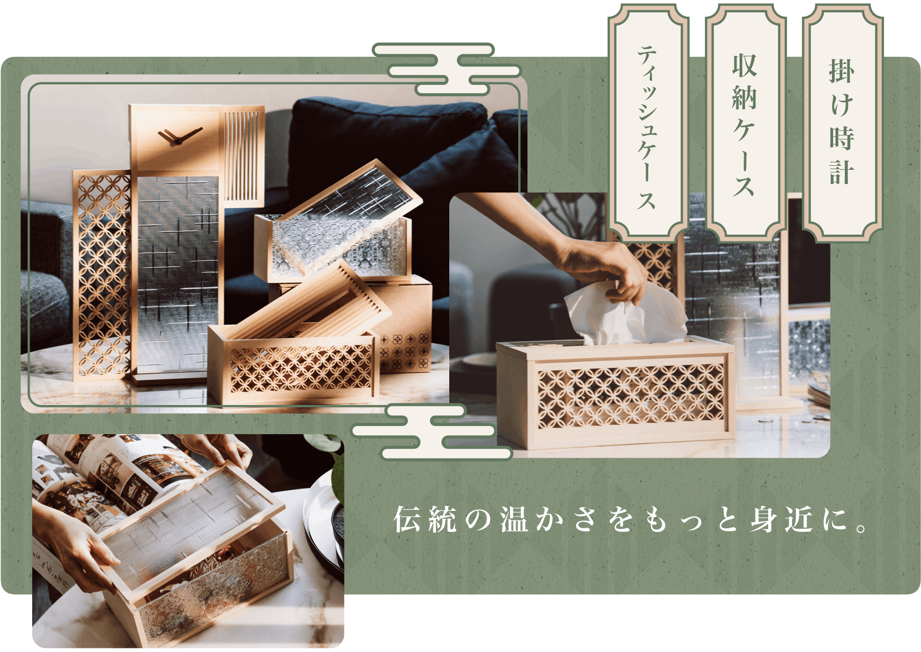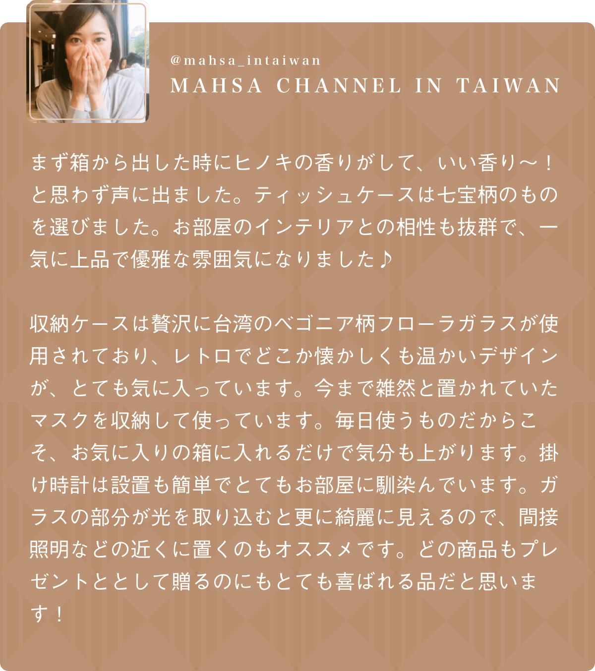 立ち上げを手がけるのは新進気鋭のクリエイティブブランド「Hands」。台湾職人の技術を「掛け時計」、「収納ケース」、「ティッシュケース」といった日常で使用できるアイテムとして復刻しました。繊細な組子の木枠に、台湾ならではのフローラガラスをあしらった三種類、暮らしの質より一層引き立たせてくれます。