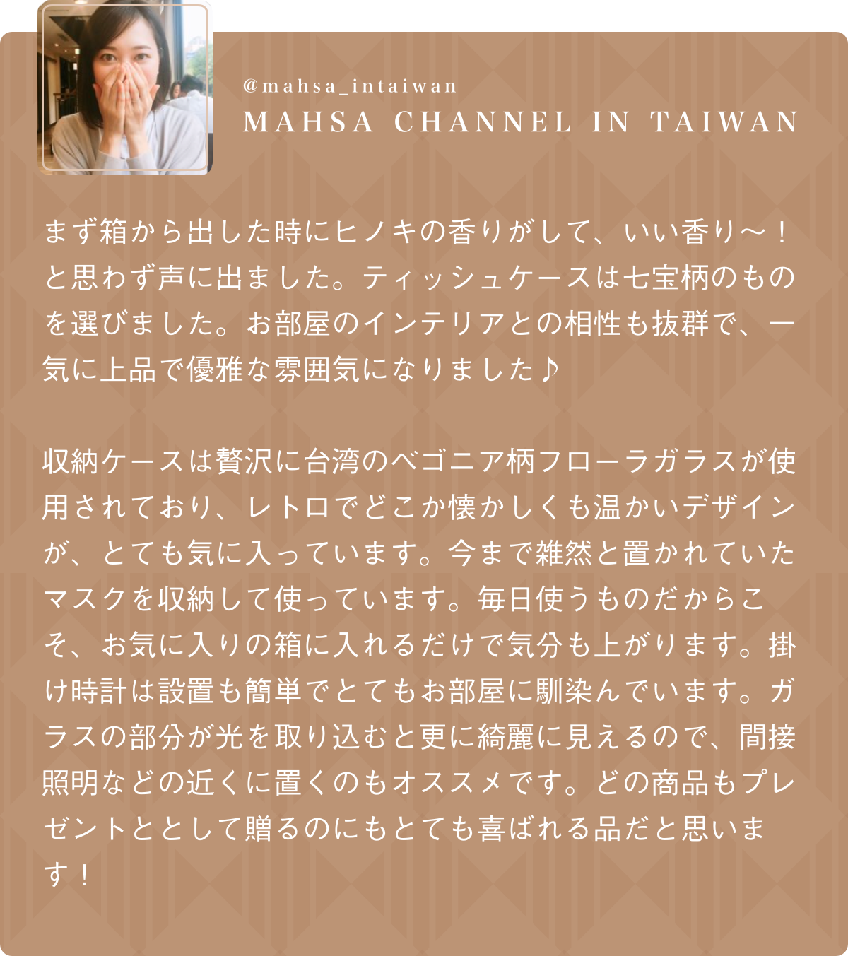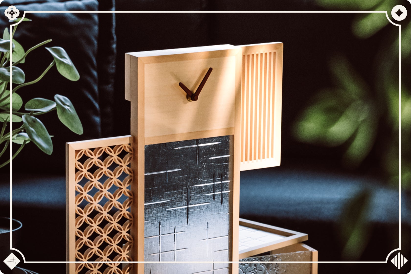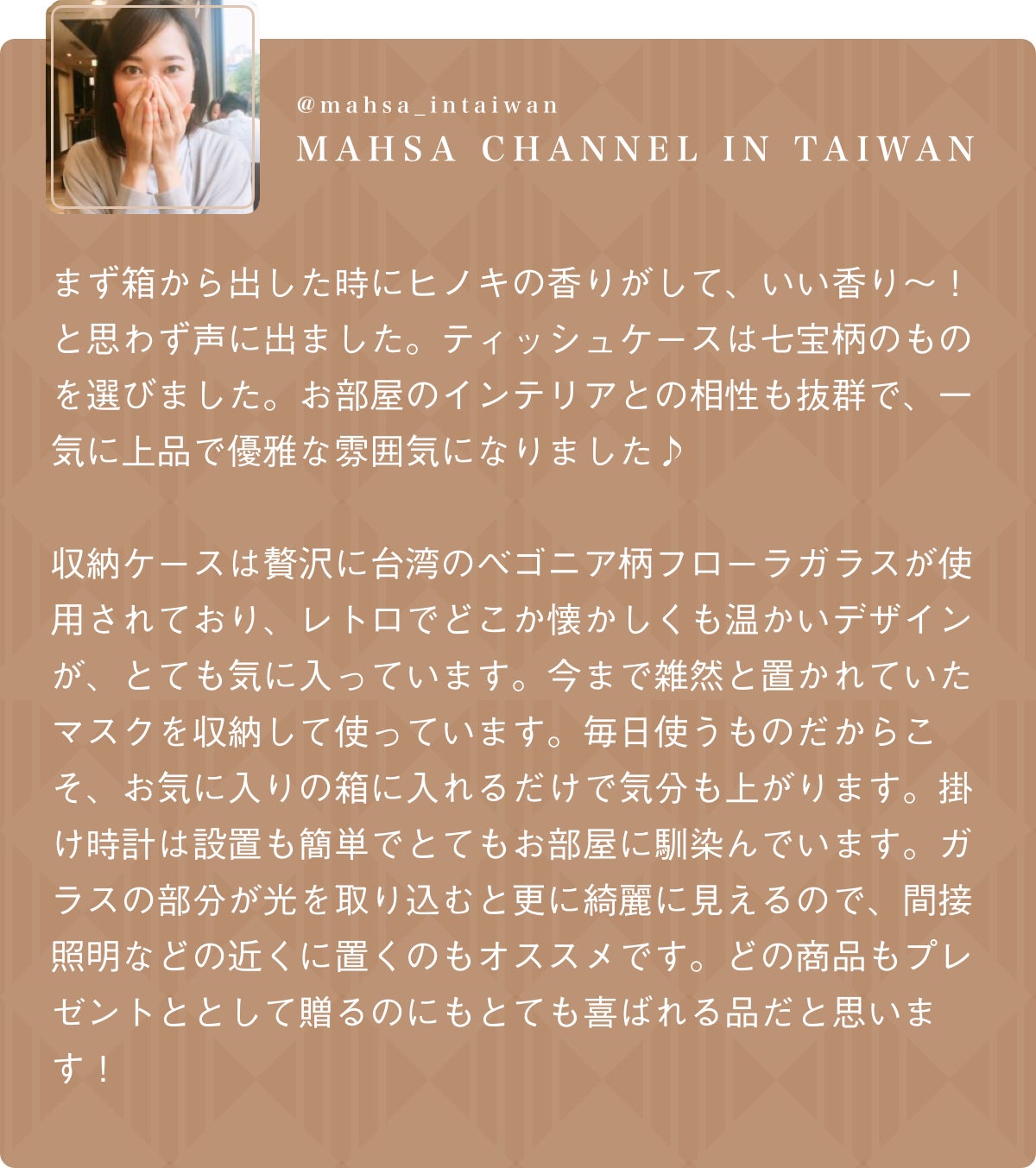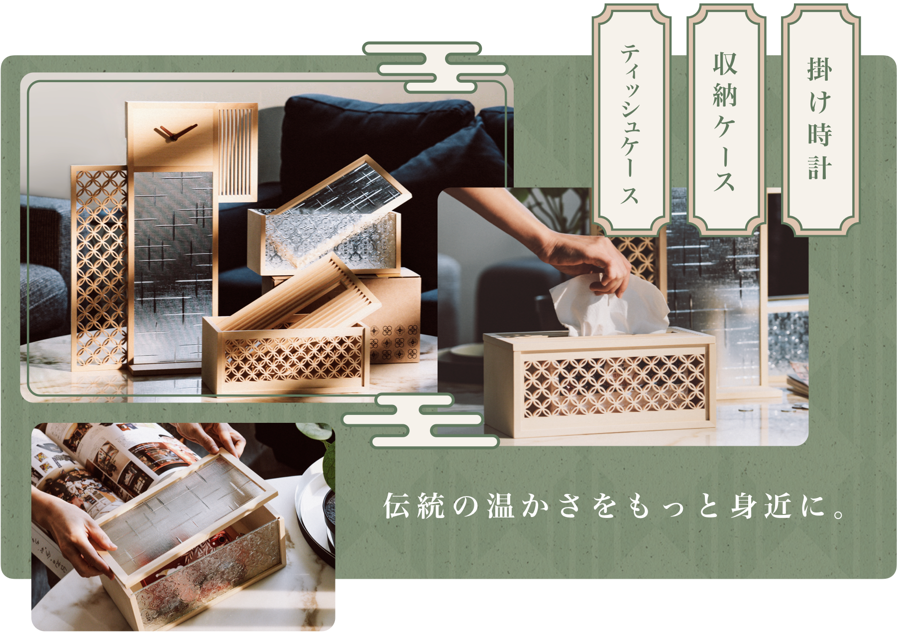 立ち上げを手がけるのは新進気鋭のクリエイティブブランド「Hands」。台湾職人の技術を「掛け時計」、「収納ケース」、「ティッシュケース」といった日常で使用できるアイテムとして復刻しました。繊細な組子の木枠に、台湾ならではのフローラガラスをあしらった三種類、暮らしの質より一層引き立たせてくれます。