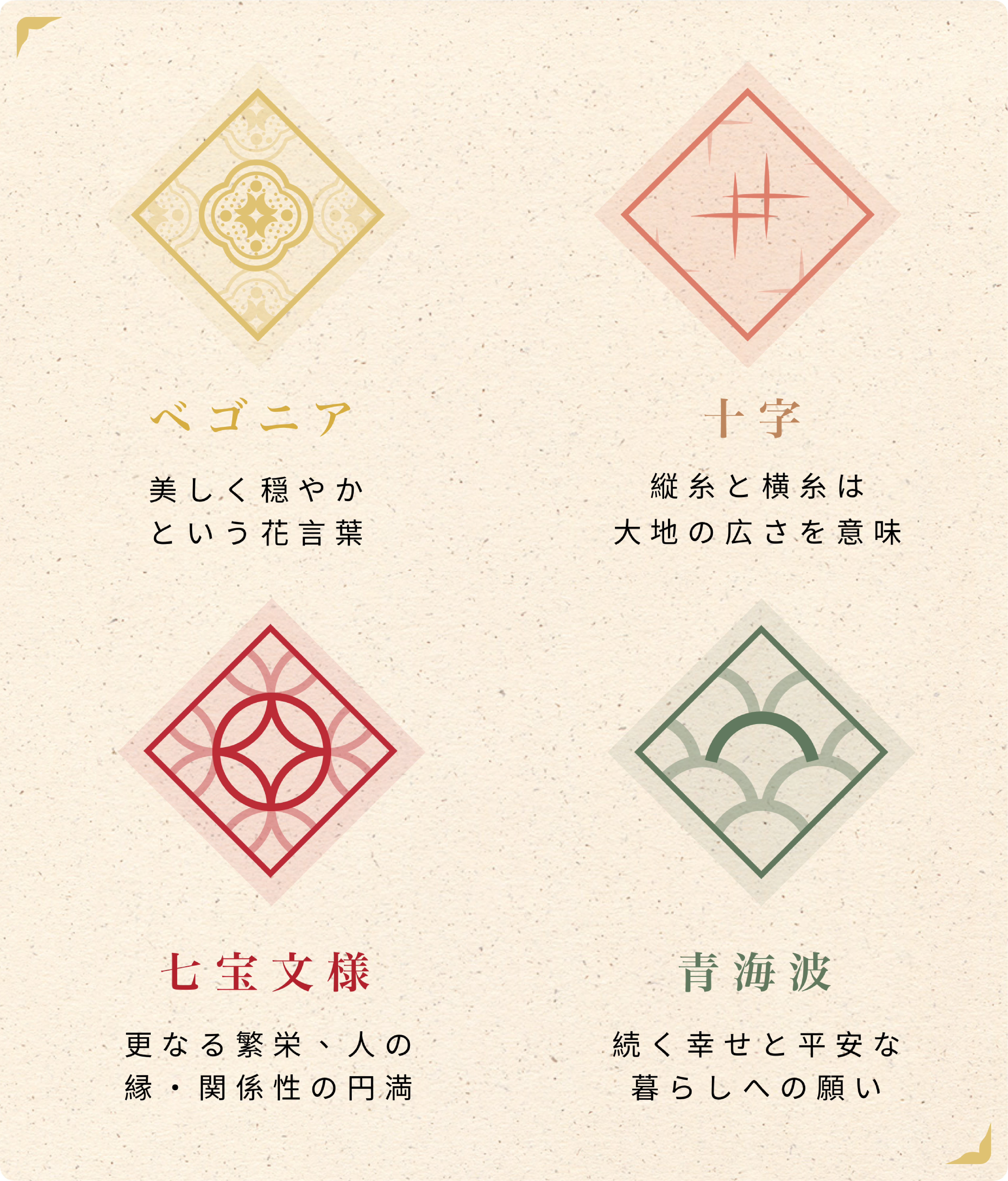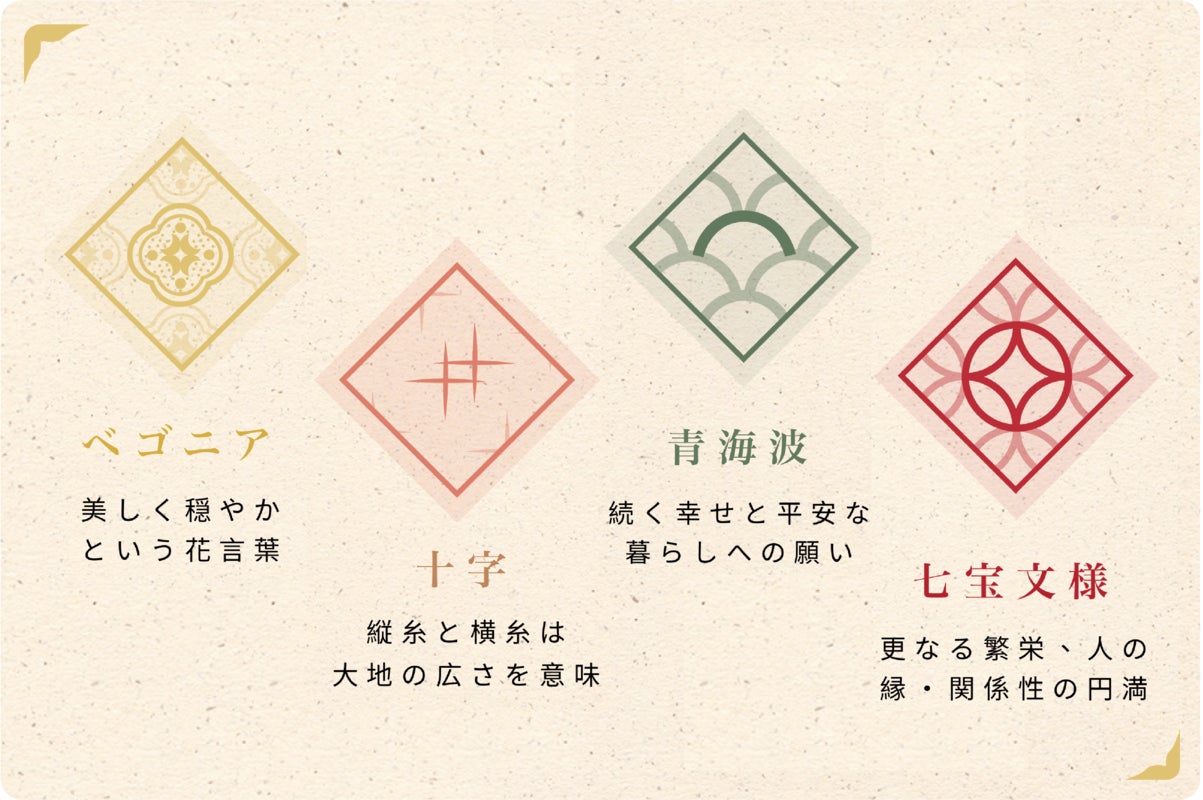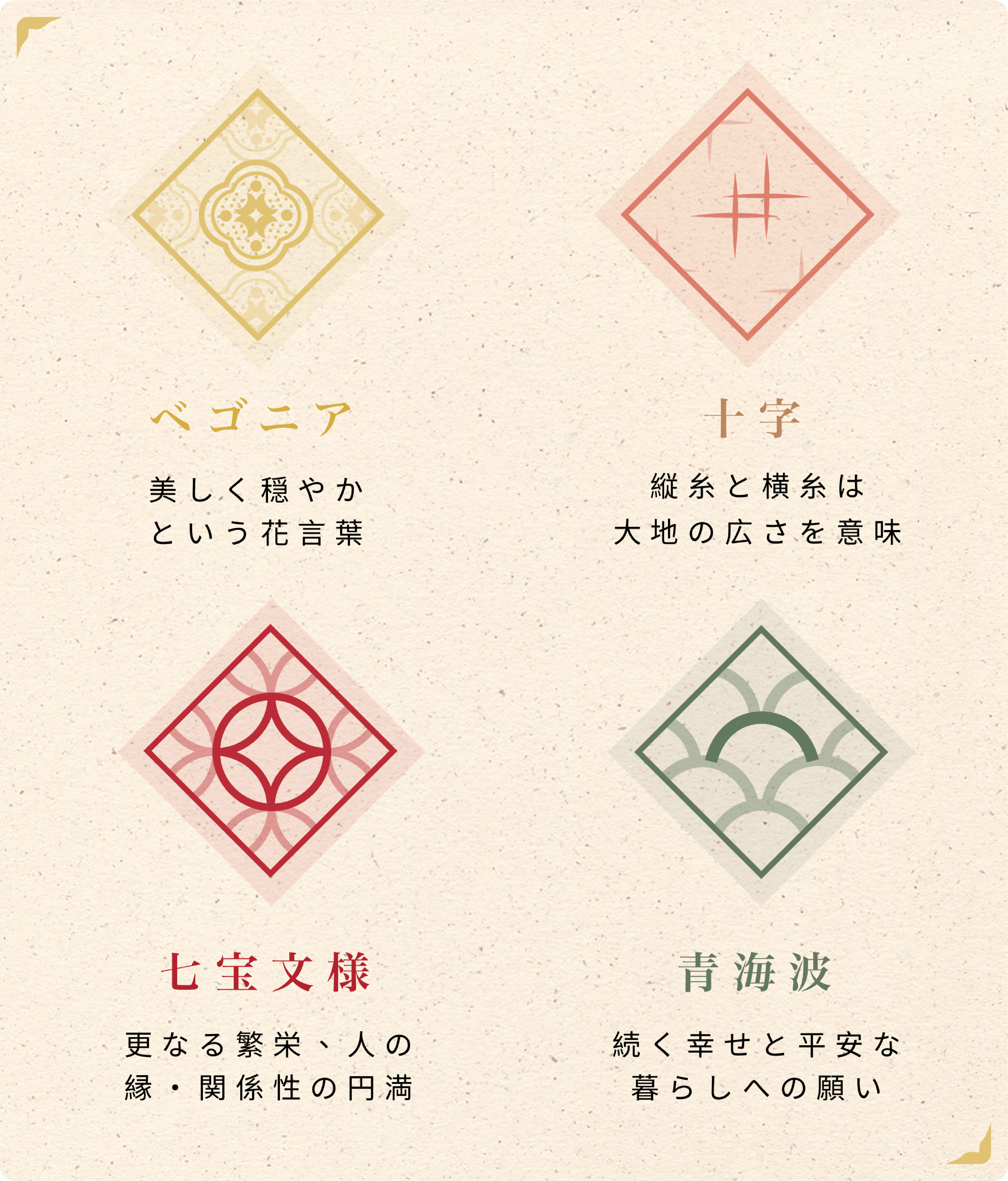 台湾を代表する精緻な文様「ベゴニア」、「十字模様」、「七宝文様」、「青海波」の4種類。文様はそれぞれに意味やストーリーを持っています。そういった背景や歴史から選ぶことができます。贈り物にもおすすめです!