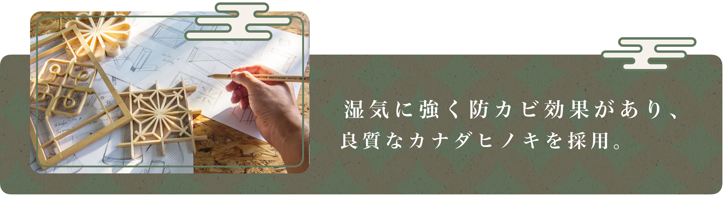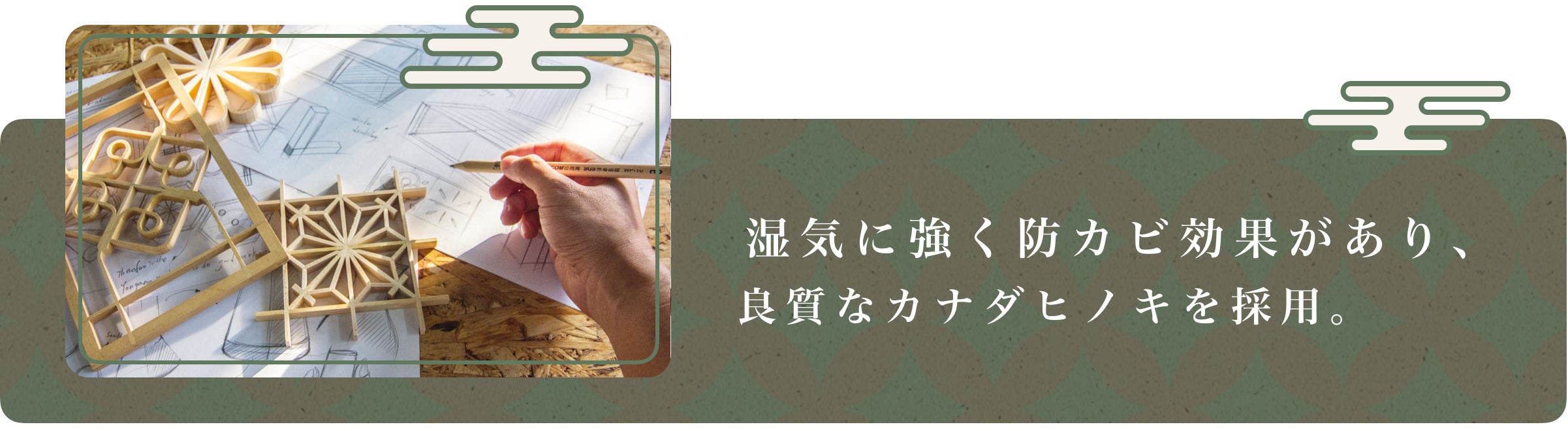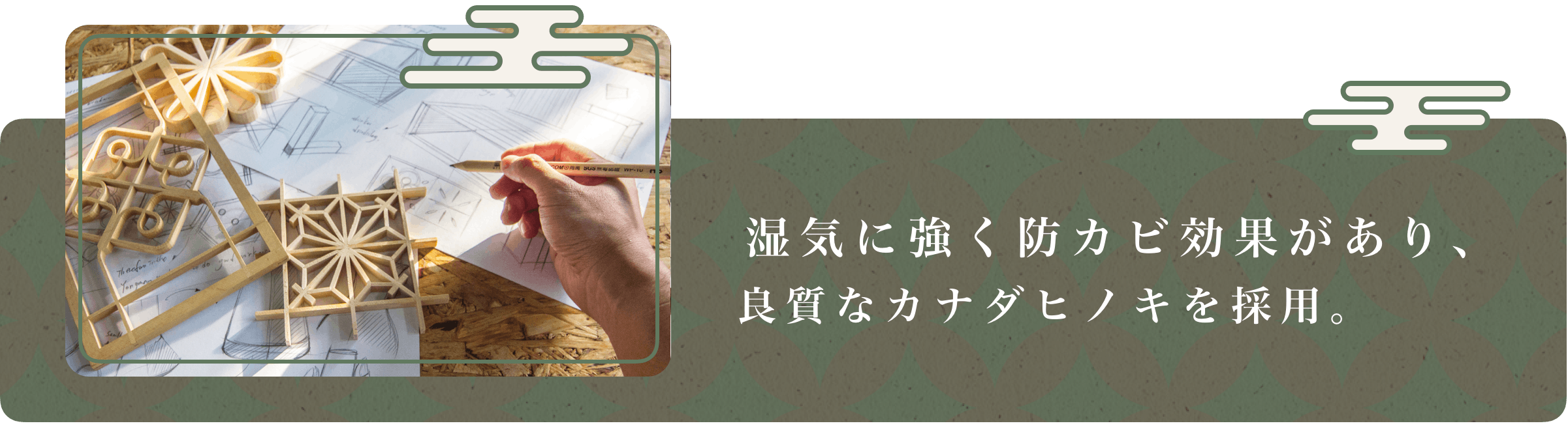 素材にもこだわり、上質なカナダヒノキを採用。カナダ桧は、極寒の大自然中でゆっくりと育つため年輪が緻密な上に、強度・硬さの点で優れ、耐久性・耐蟻性も備え、湿気に強く防カビ効果があります。また、芳香が強く、穏やかな気持ちになる「ヒノキチオール」を含んでいます。