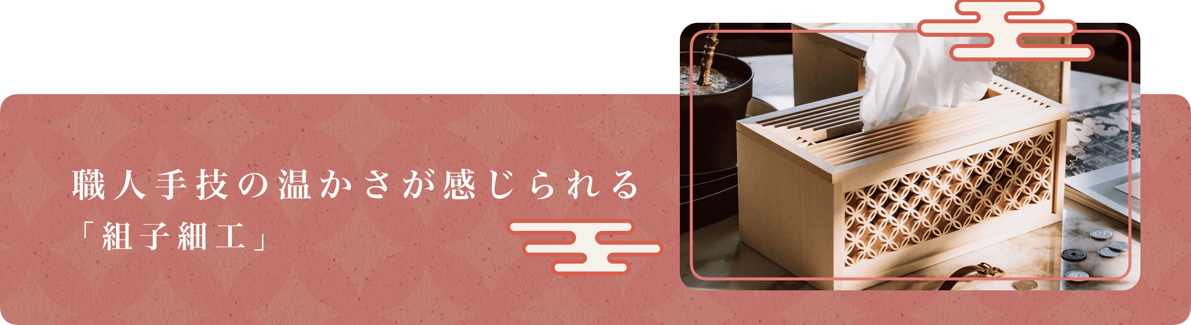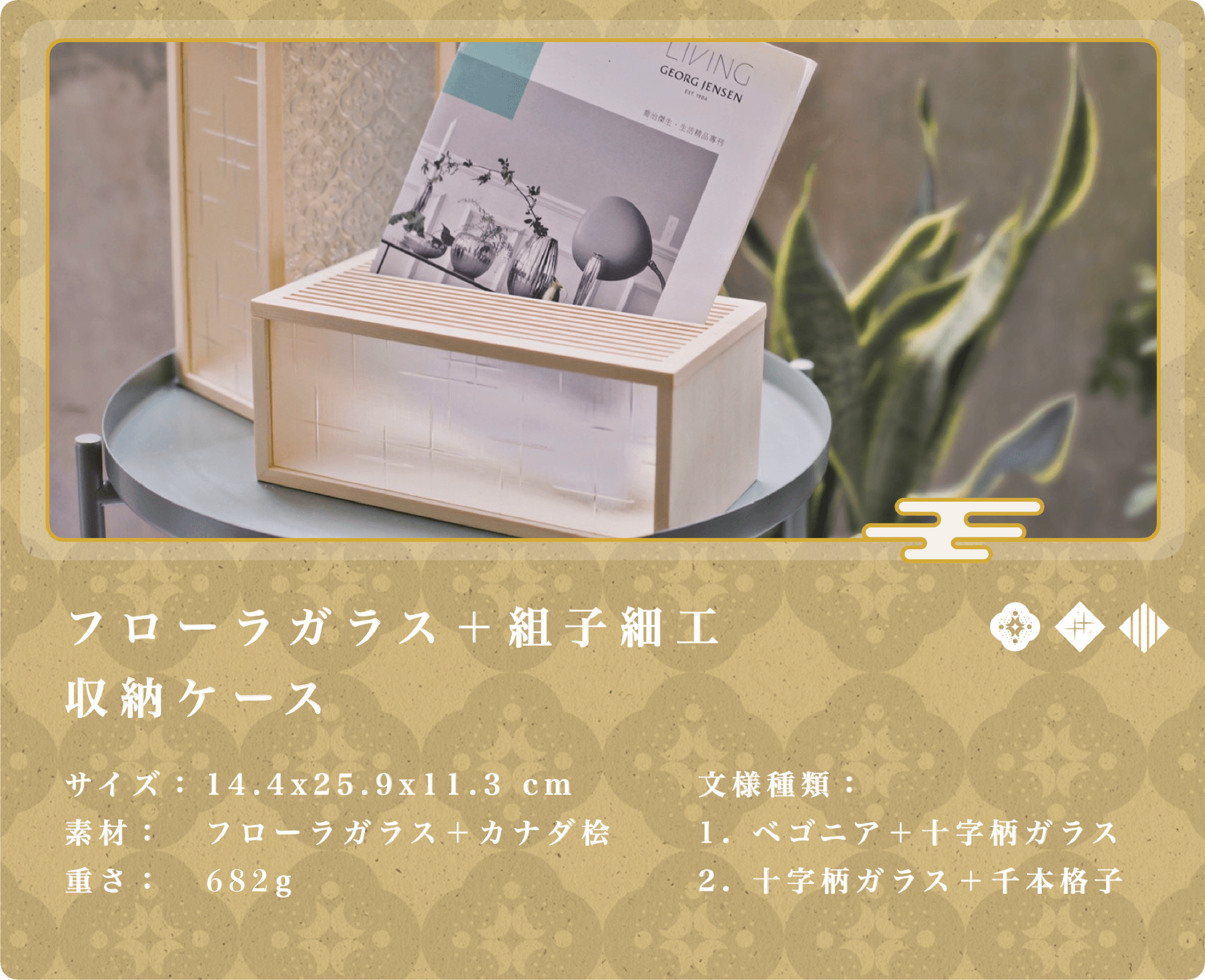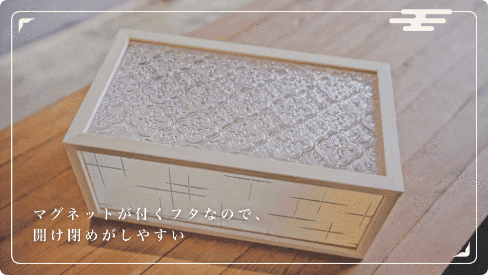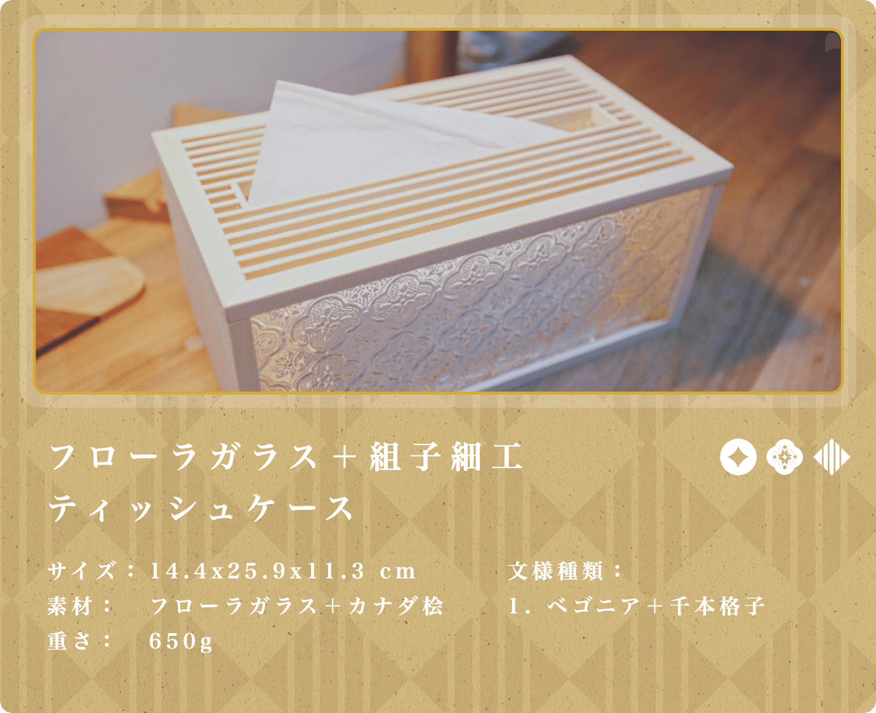 ①「フローラガラス」と「組子細工」が施されたティッシュケース: